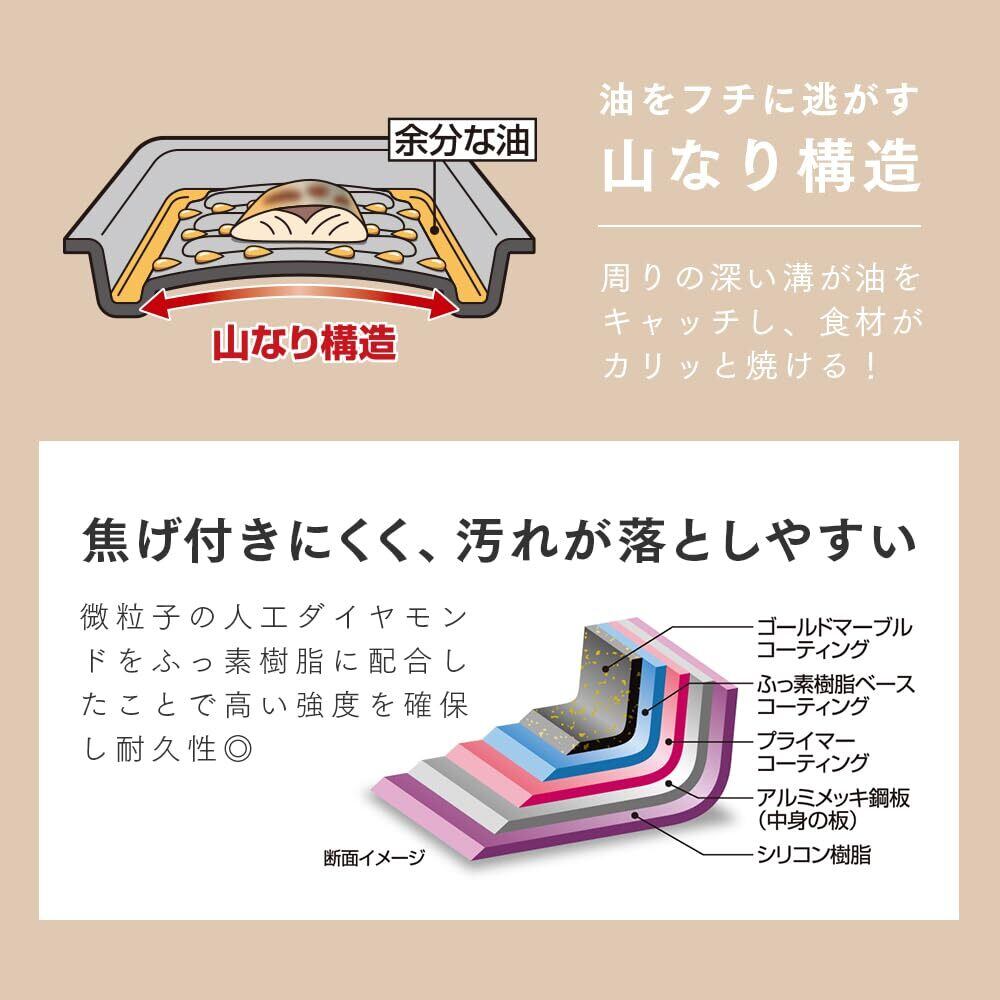 山なり構造が油をフチへ逃がし、食材がカリッと焼けます。
