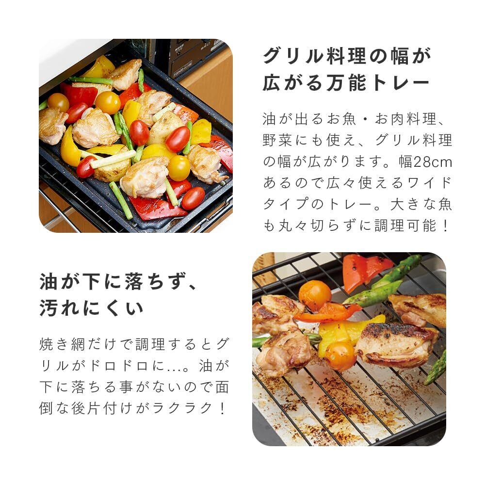 【グリル料理の幅が広がるワイドタイプの万能トレー】大きな魚も丸々切らずに調理が可能!幅28cmあるので広々使える、ワイドタイプのグリルトレー。波形の油きりのおかげで、留まった油をキッチンペーパー等でサッと拭けてお手入れ簡単なので、油が出るお魚・お肉料理、野菜にも使え、グリル料理の幅が広がります。