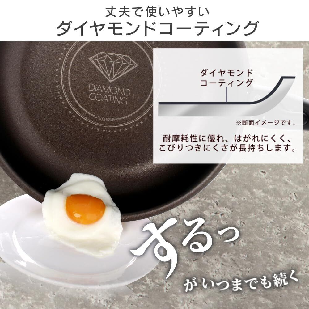 フッ素樹脂に高硬度の人工ダイヤモンドを混ぜることでコーティングがさらに長持ちするIH対応のダイヤモンドコートパンです。
