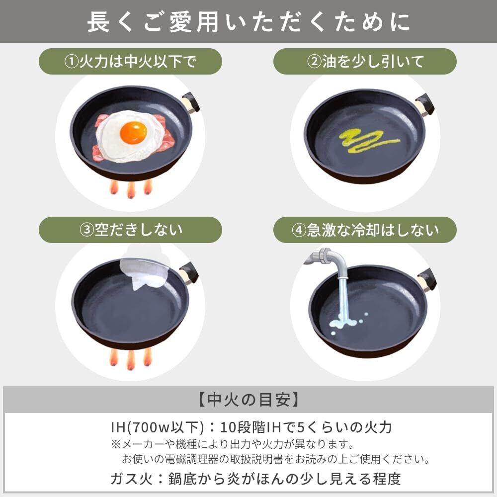 製品の取扱説明書をよくお読みいただき、安全にお使いください。焦げ付きにくい加工ではありますが、高温での使用や急激な温度変化にはご注意ください。使用後はしっかり冷ましてから洗浄してください。