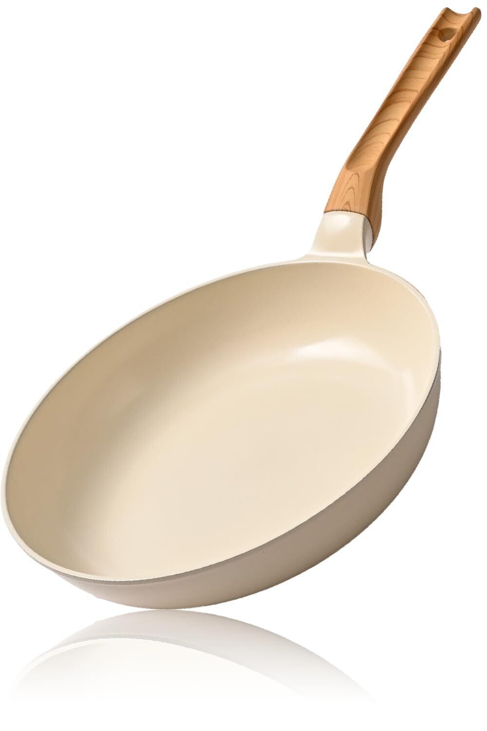 【料理が映えるスタイリッシュなデザイン 】本体はホワイト、ハンドル部分はウッド調。料理のテンションが上がるようなおしゃれなフライパンを目指しました。