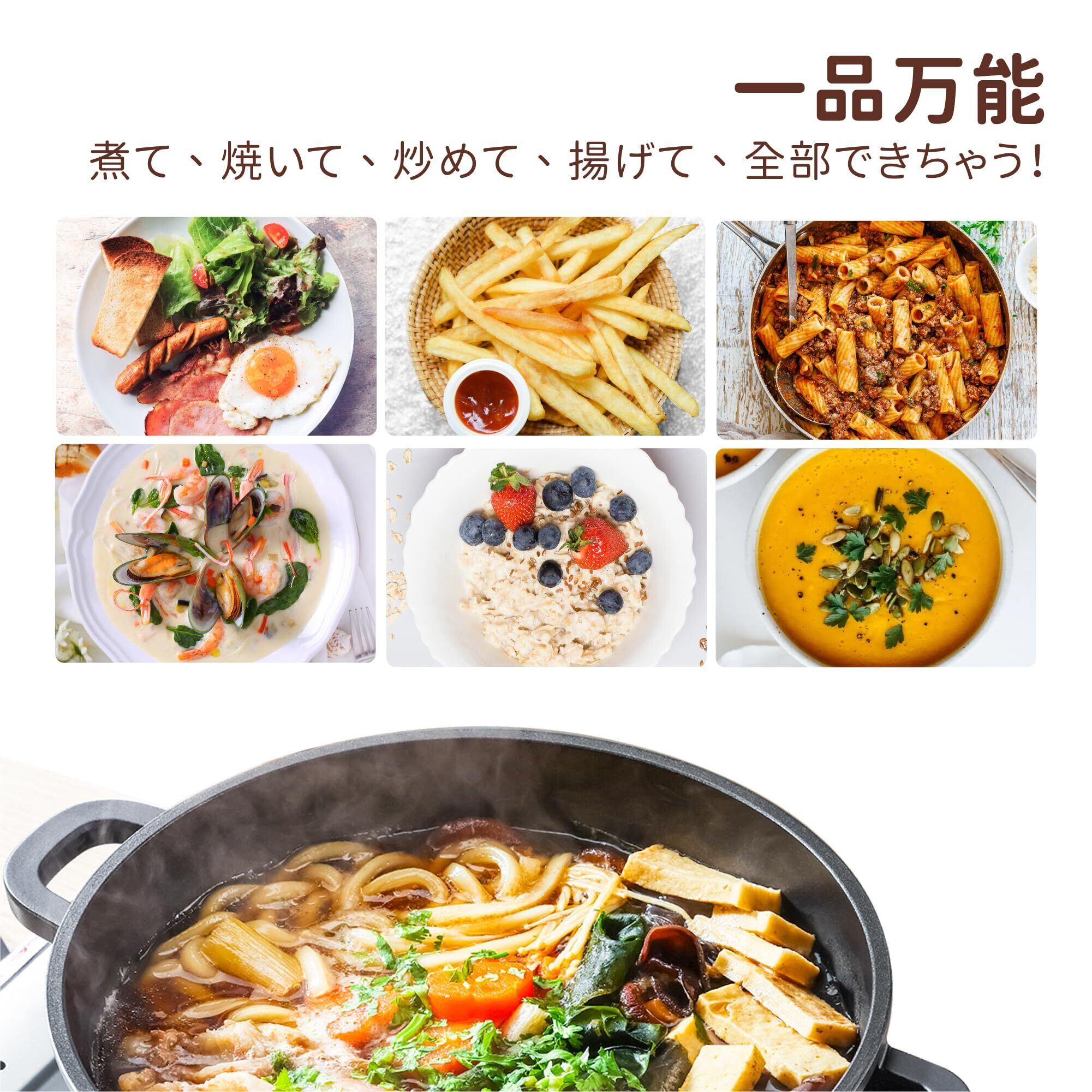 【IH対応/ガス対応・一品万能】IH、ガス火などオール熱源対応です。すき焼き、煮物、カレーなどのお馴染みの料理はもちろん、焼き餃子、焼きチキン、炒め物もこれ一品でOK!フライパンでできることはすべて、この鍋でもできて、本当に万能な一品です。