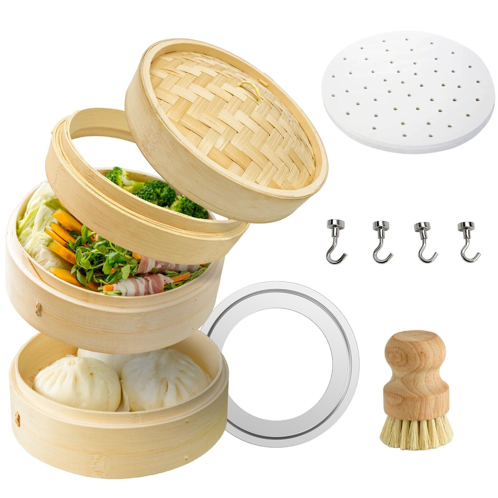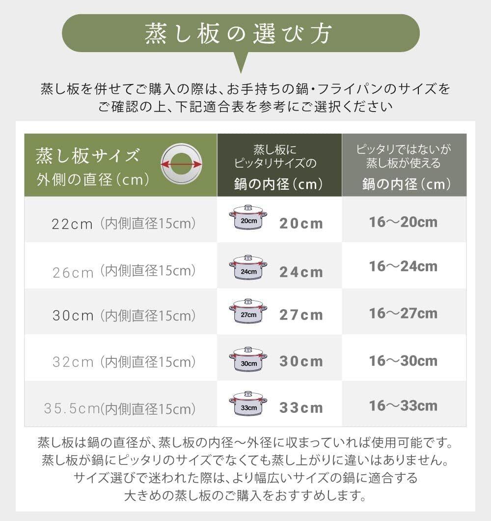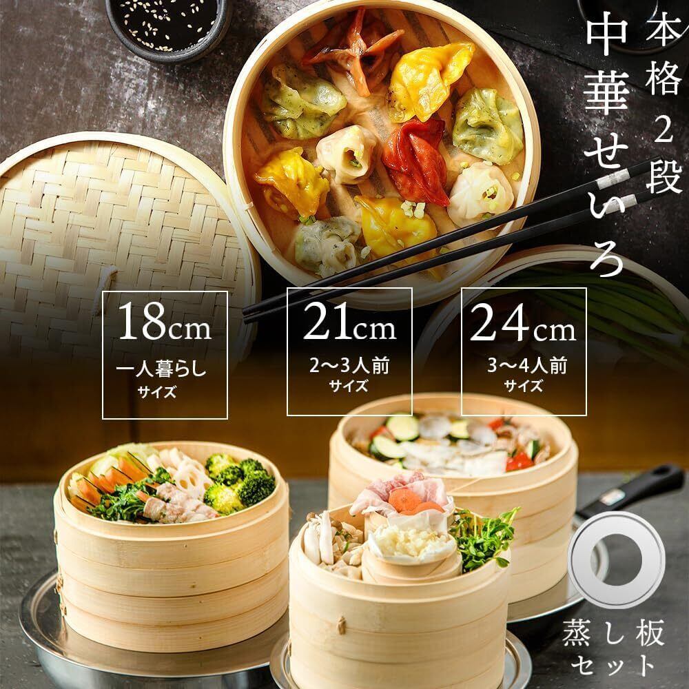 【セット内容】①本体二段:18~24cm ②蒸し板(受け台):20cm~35.5cm(あり/なし選択可) ③フタ 1点 ④高さ調整輪 1点 ⑤クッキングシート 100枚 ⑥紙ヤスリ(ささくれ防止用 ) 1点 ⑦せいろ用キッチンブラシ 1点 ⑧マグネットフック 4点