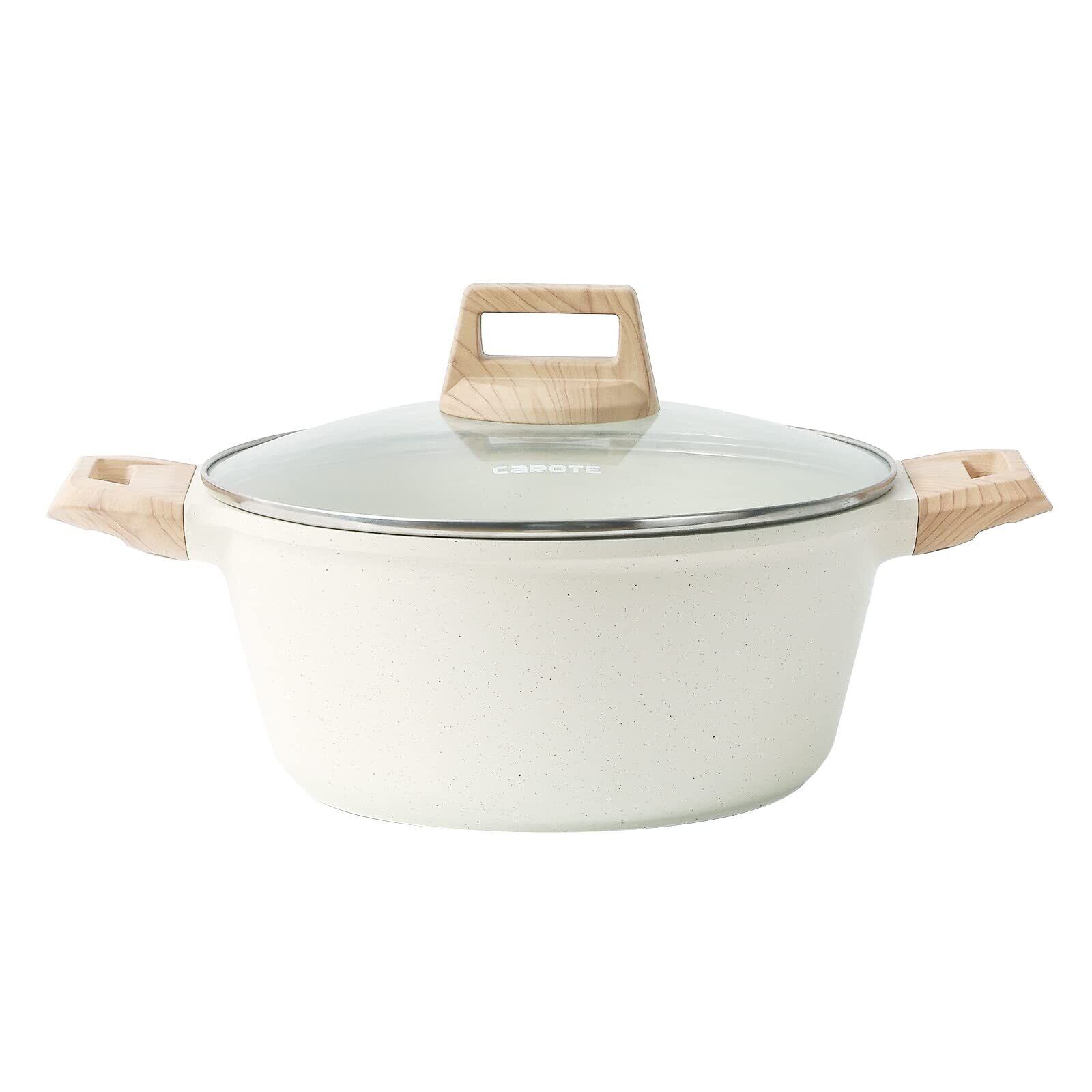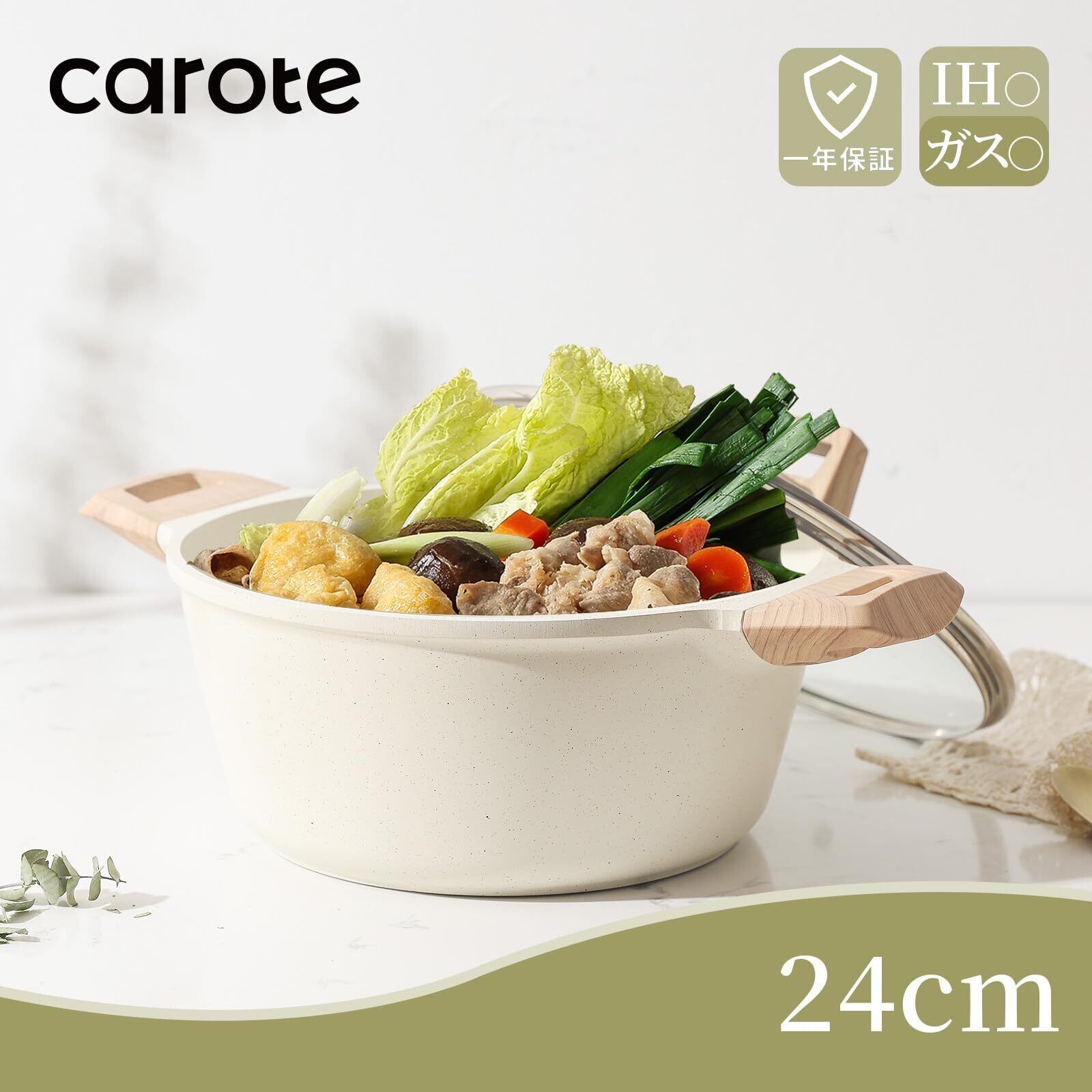 CAROTE カローテ 両手鍋 卓上鍋 24cm IH対応 PFOA PFOS フリー マーブルコーティング くっつきにくく手入れ簡単 煮物 カレー シチュー 強化ガラス蓋付き ベージュ1年「アイスクリーム」シリーズ