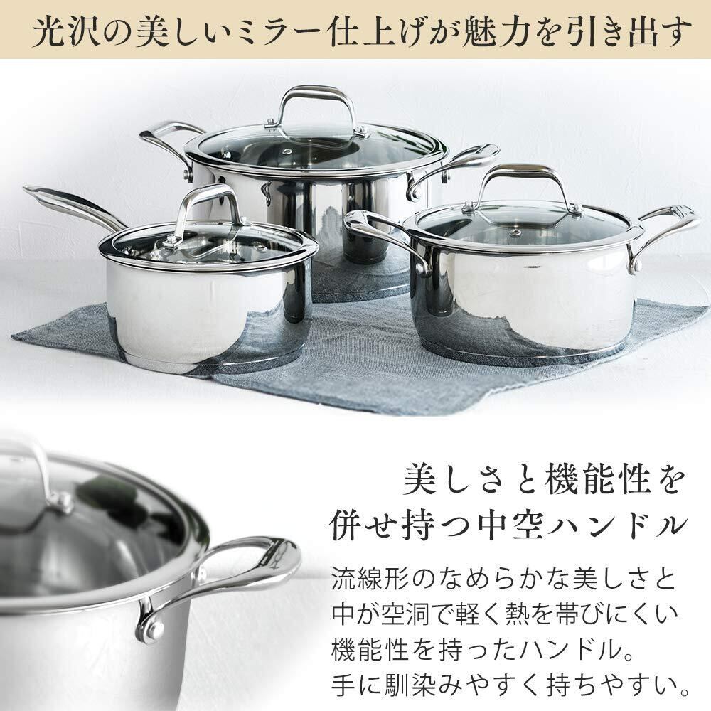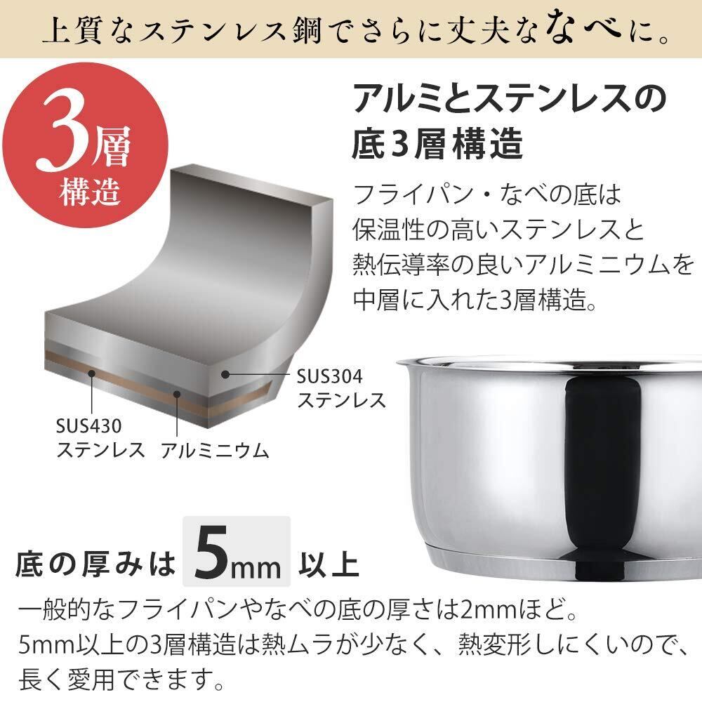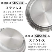 材質:本体:ステンレス鋼(クロム18%、ニッケル8%)、取手:ステンレス鋼(クロム16%、ニッケル6%)、はり底:アルミニウム合金、ステンレス鋼(クロム16%)