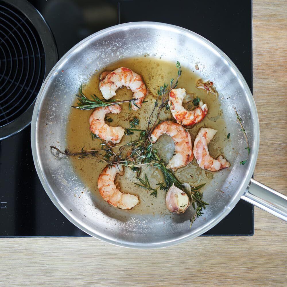 【料理の仕上がりをワンランクアップ】 熱伝導性と保温性を両立したSIGMA Clad 3-PLY(全面3層)構造。アルミニウムをステンレスで挟み込んだ設計で、効率的な加熱が可能に。食材を入れても温度変化が少なく、焼きムラなく調理でき、お肉をこんがりジューシーに焼き上げるのにぴったり。