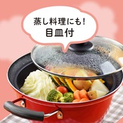 本体:アルミニウム合金、内面:ふっ素樹脂加工、外面:焼付塗装、はり底:ステンレス鋼、ハンドル・つまみ:フェノール樹脂、ガラス蓋:強化ガラス、蒸し目皿:アルミニウム合金(ふっ素樹脂加工)