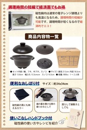 付属のふたや中ぶた、スノコを使うことで、調理の幅が広がります。蒸し器としても活用できるため、健康的な料理を簡単に作ることが可能です。また、鍋敷きや鍋つかみ、黒おしぼりもセットになっており、調理から食卓まで一貫してお使いいただけます。
