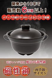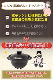 【商品概要】電子レンジ専用調理鍋です。電磁波(マイクロ波)を拡散させずにコントロールし、素材の旨味と栄養価をアップさせる耐熱陶器製の調理鍋です。※電磁波(マイクロ波)を特殊フェライト(磁性体)が吸収し遠赤外線に転換し、食物を調理します。