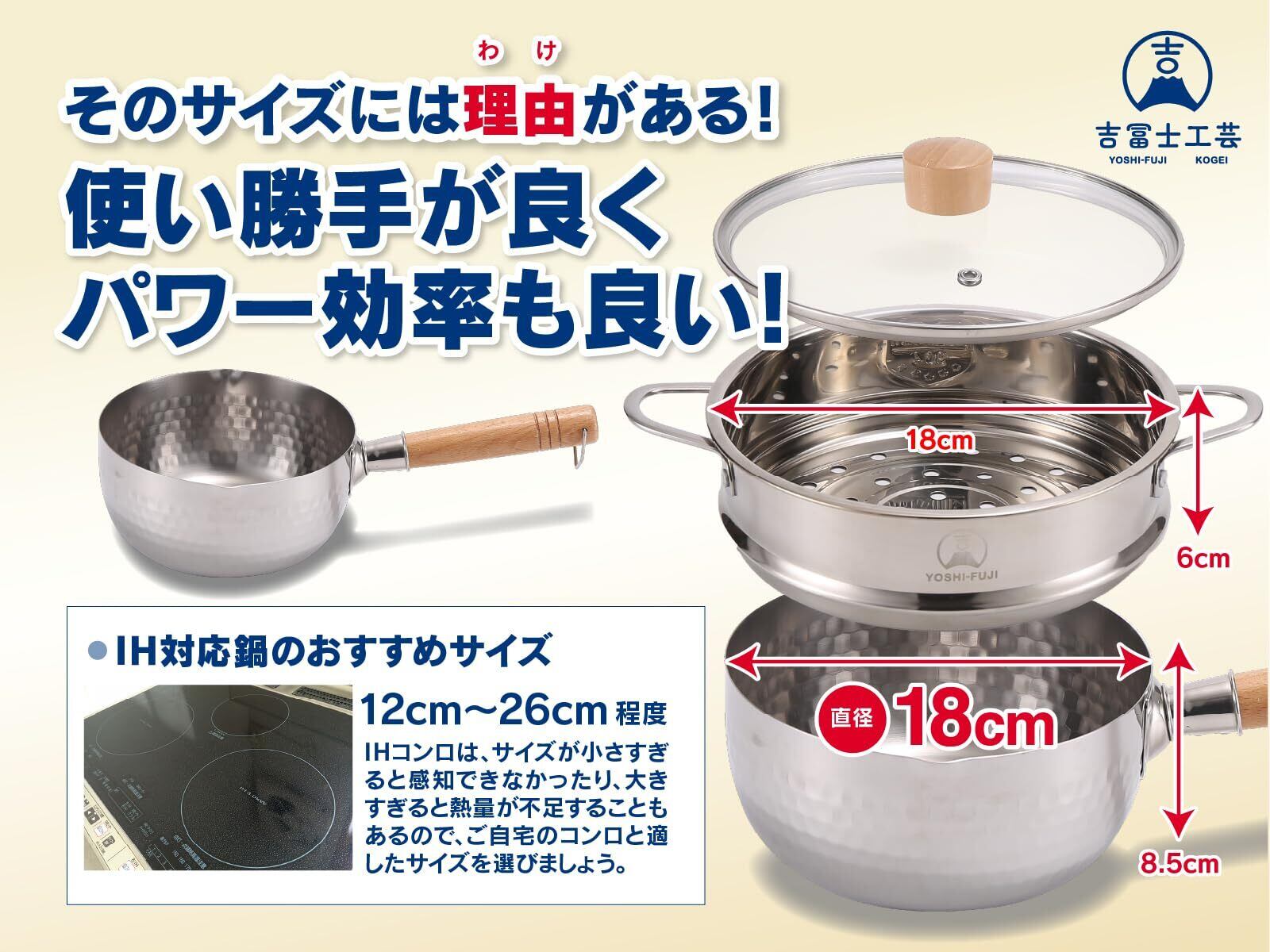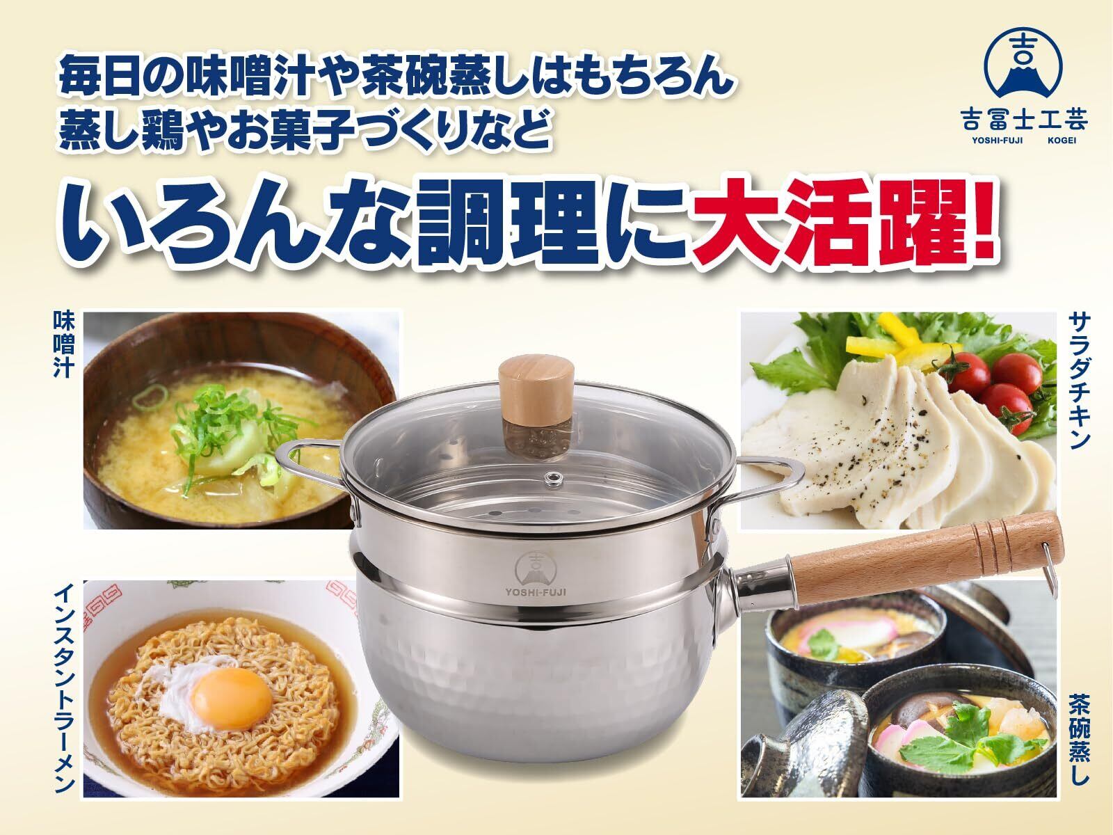 吉冨士工芸 蒸し器 雪平鍋 18cm IH ガス火対応 ステンレス製 強化ガラス蓋 蒸し器付き 蒸し料理 両側注ぎ口 片手鍋 お手入れ簡単 (ステンレス製, 18cm)