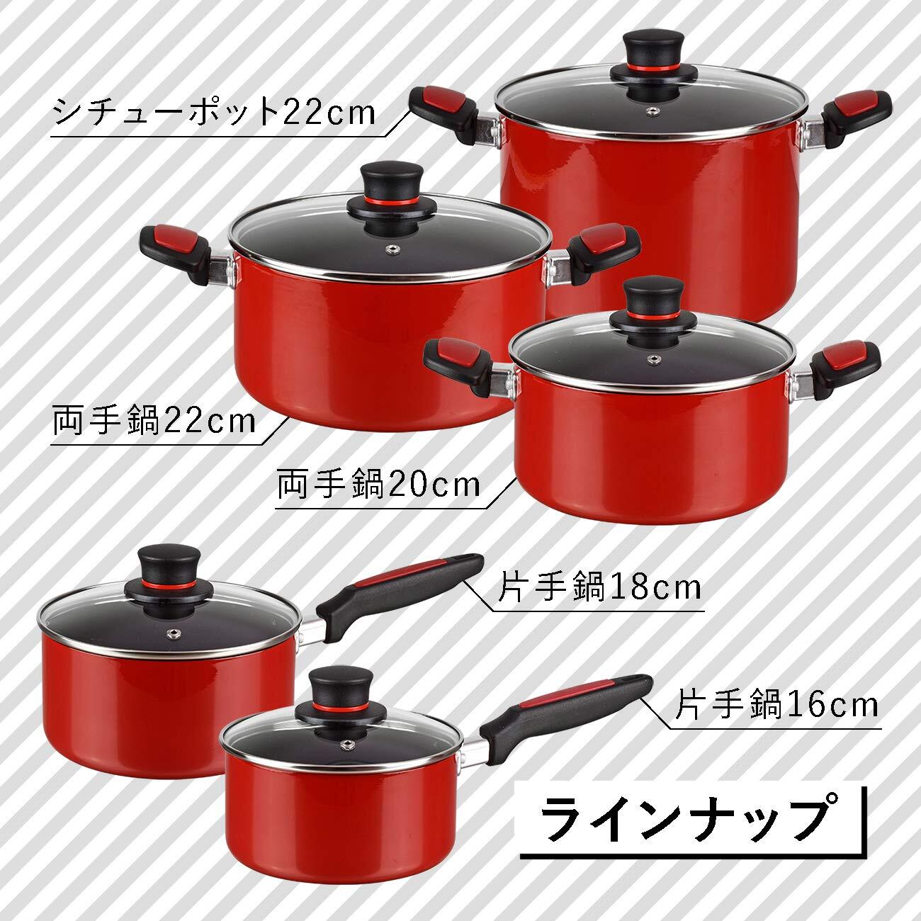 本体:アルミニウム合金、内面:ふっ素樹脂加工、外面:ほうろう、はり底:ステンレス鋼、ハンドル・つまみ:フェノール樹脂、ガラス蓋:強化ガラス