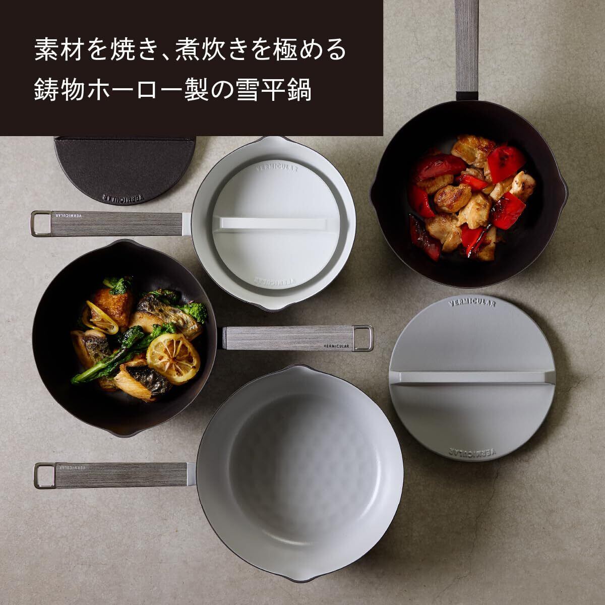 雪平鍋なのに焼きつけが得意。バーミキュラ独自の「瞬間蒸発ホーロー」を採用したことで、バーミキュラ フライパン級の焼きつけ性能を実現しました。