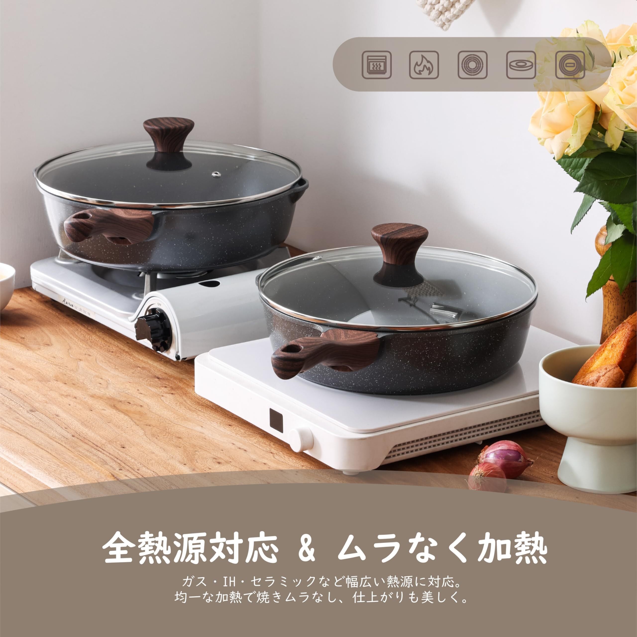 【IHもガス火も対応する頼れる一台】IH、ガスなど様々な熱源に対応。熱が均一に伝わり、焼きムラなし。深型で炒め物や煮込みにもぴったり。