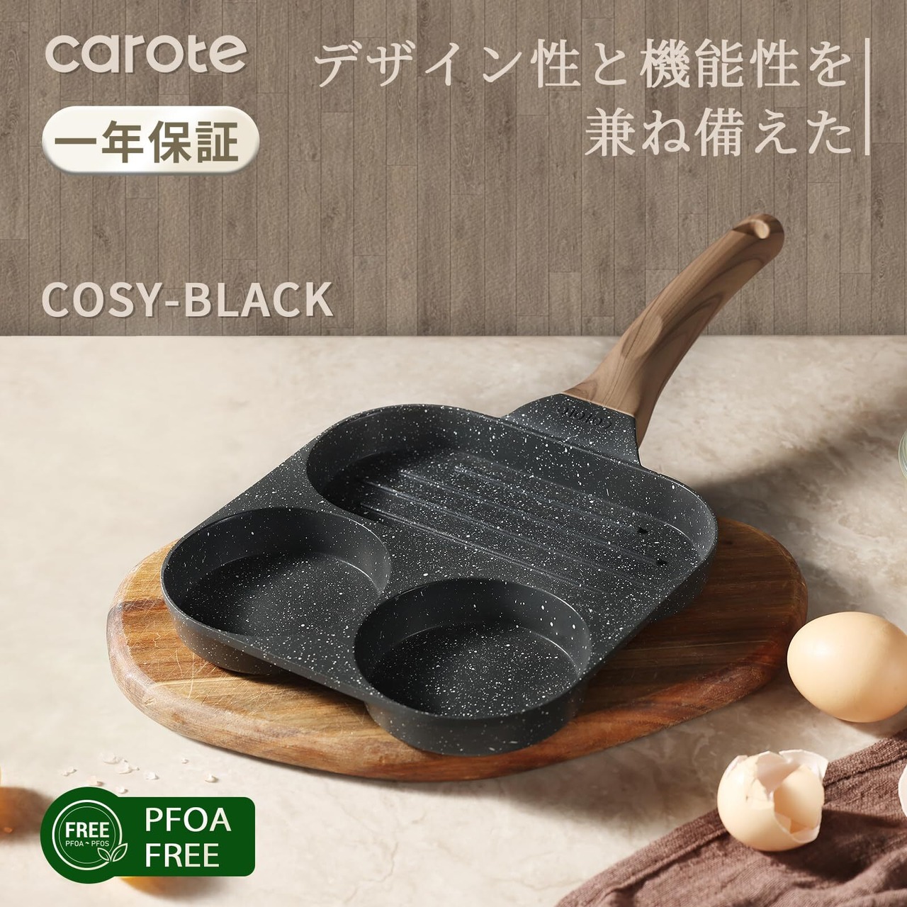 CAROTE カローテ 目玉焼きフライパン 仕切りパン 3in1 2つ穴円形フライパン IH対応 PFOA PFOS フリー くっつきにくい お手入れが簡単 朝食 お弁当 一年補償 CosyBlack シリーズ ブラック 黒