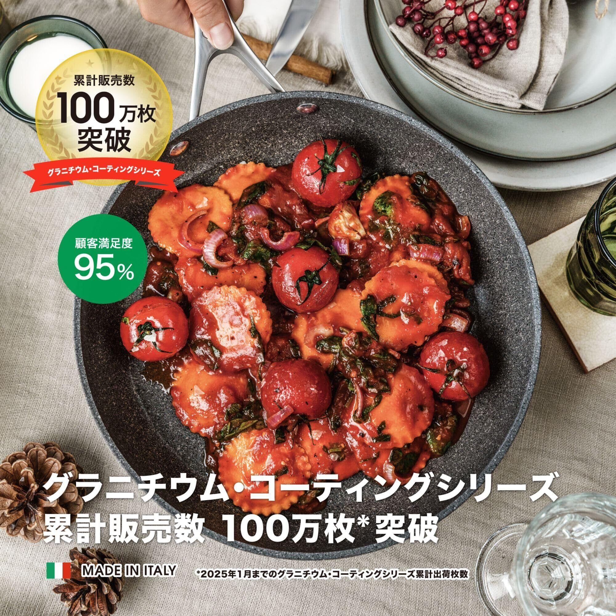 イタリア製バッラリーニ「サリーナ」シリーズは、チタンを含む7層「グラニチウム Ti-X」コーティングで焦げ付きにくく、日常使いに耐える高い耐久性を備えています。