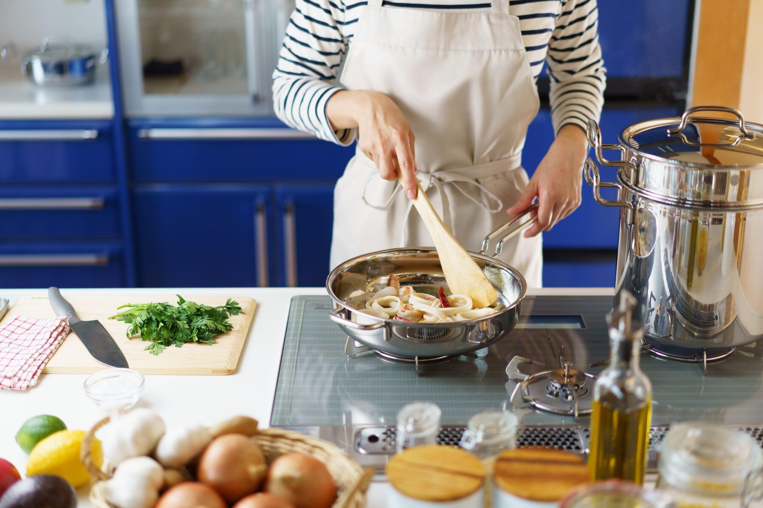 鍋製品の材質は、熱伝導性の高いアルミニウムをステンレスで挟んだ全面7層構造。鍋ごとオーブンで使用することもできるし、鍋そのものをオーブンのように使って、ケーキを作ることもできるほど高性能だ。ハンドルもステンレスなので「熱くなるのでは」と不安に感じる向きもあるかもしれないが、この部分が握れないほど熱ければ火力が強すぎる目安になるというから、よく考えられている。