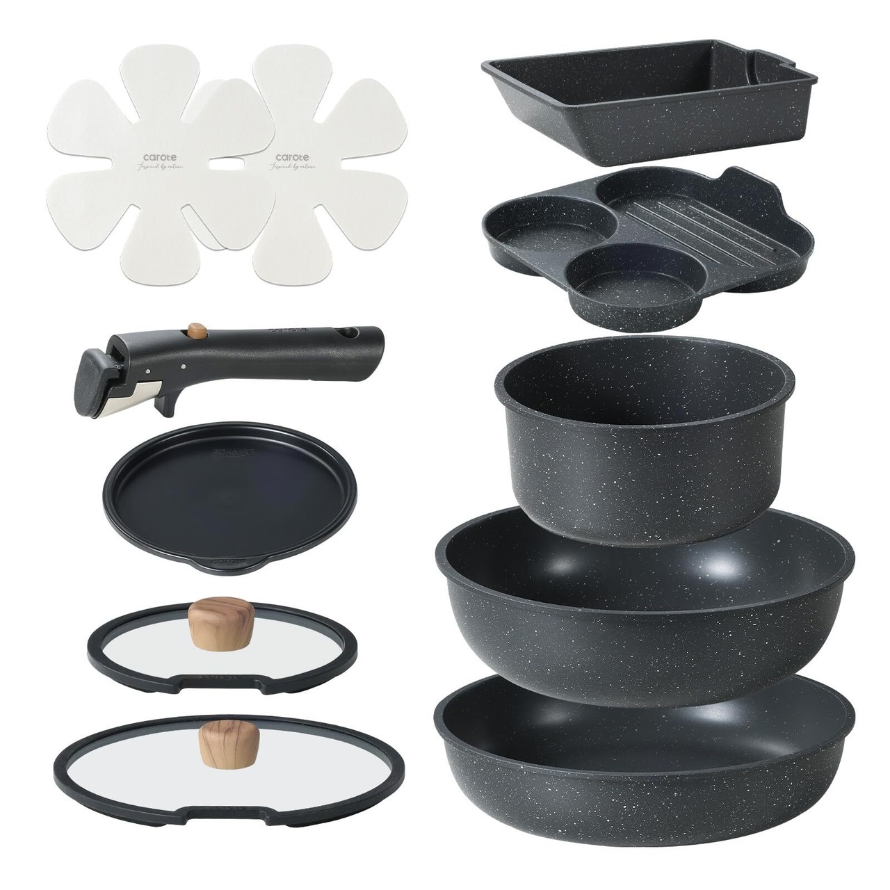 CAROTE カローテ フライパン セット 11点 IH·ガス火対応 PFOAなどの有害物質不使用 5層構造 鍋セット 卵焼き 仕切りフライパン 取っ手のとれる マーブルコート こびりつきにくい 手入れ簡単 一年 ブラック 黒 Grain グレインシリーズ