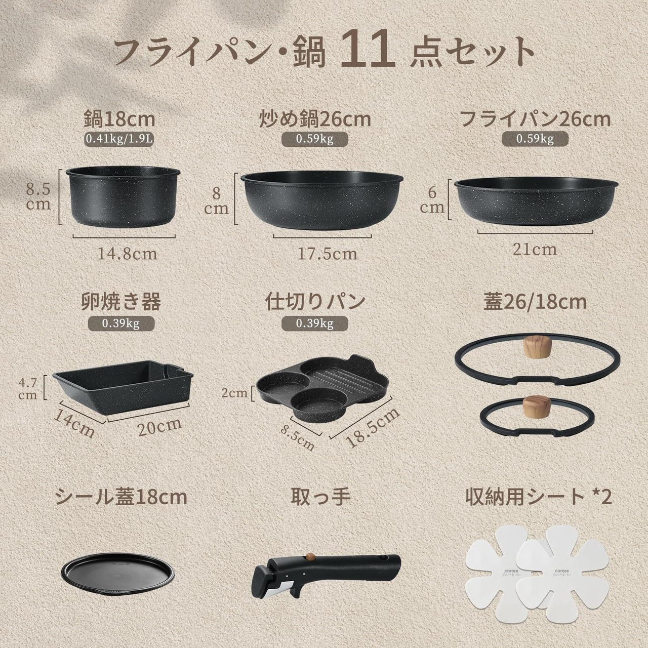 【セット内容】鍋18cm/0.43kg、フライパン 26cm/0.59kg、炒め鍋26cm/0.58kg、卵焼きフライパン/0.39kg、仕切りフライパン/0.52kg、ガラス蓋18cm、ガラス蓋26cm、専用取っ手×1本、シール蓋18cm、収納用マット*2枚、梱包重量(約): 4.6kg