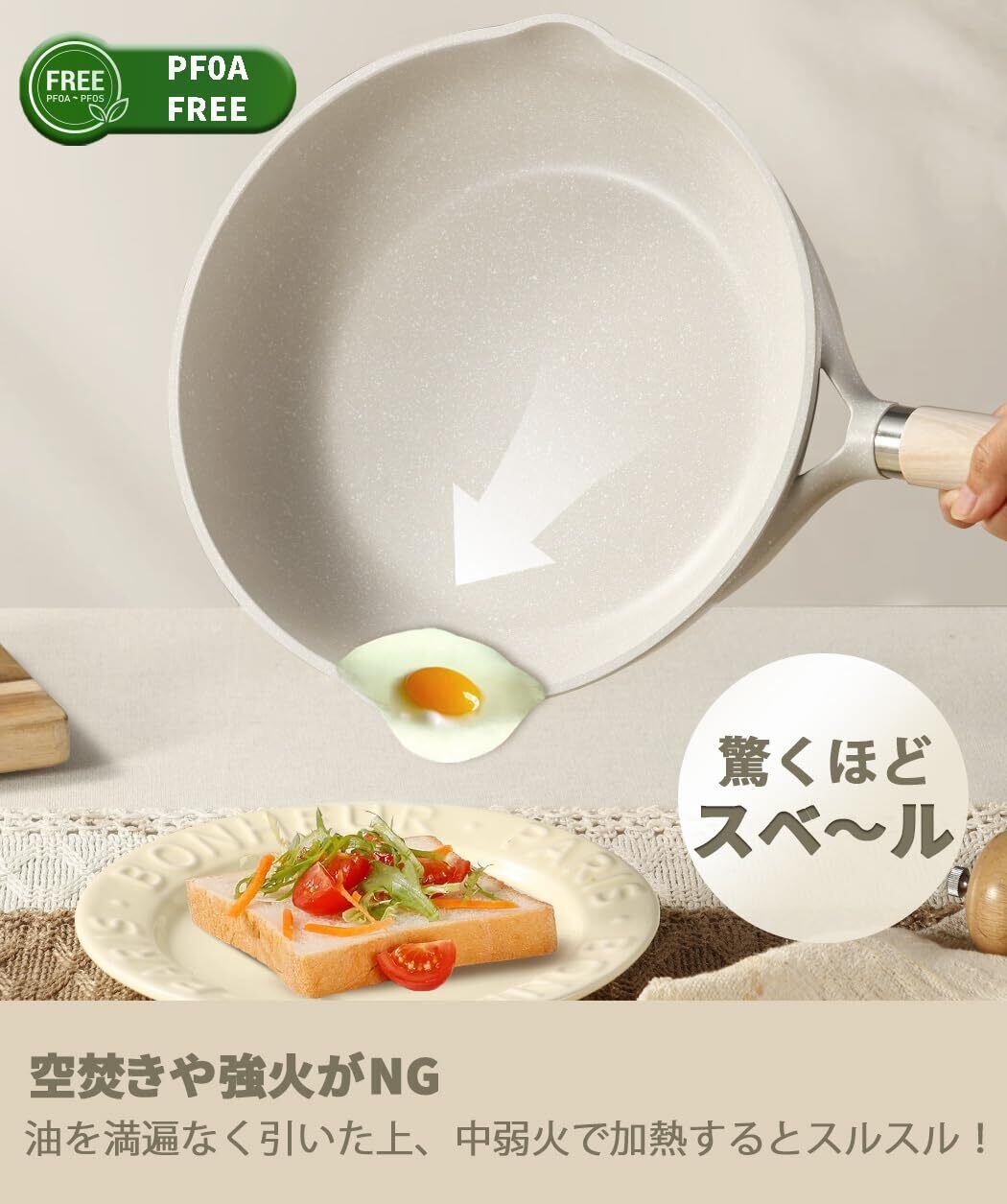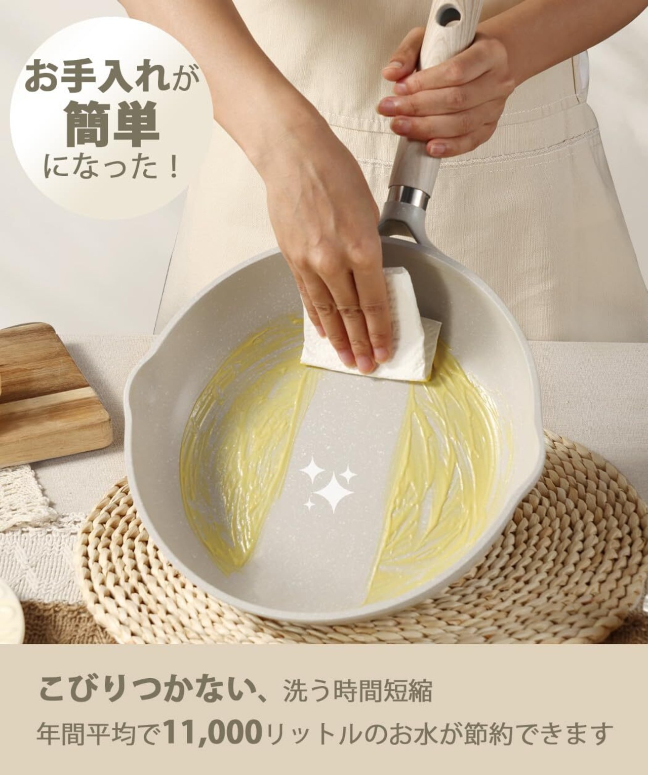 【快適な調理体験】内面がマーブルコートをしているため、焦げ付きにくくスムーズに調理できます。調理後もスポンジで軽く拭くだけで、汚れもスルッと落ちます