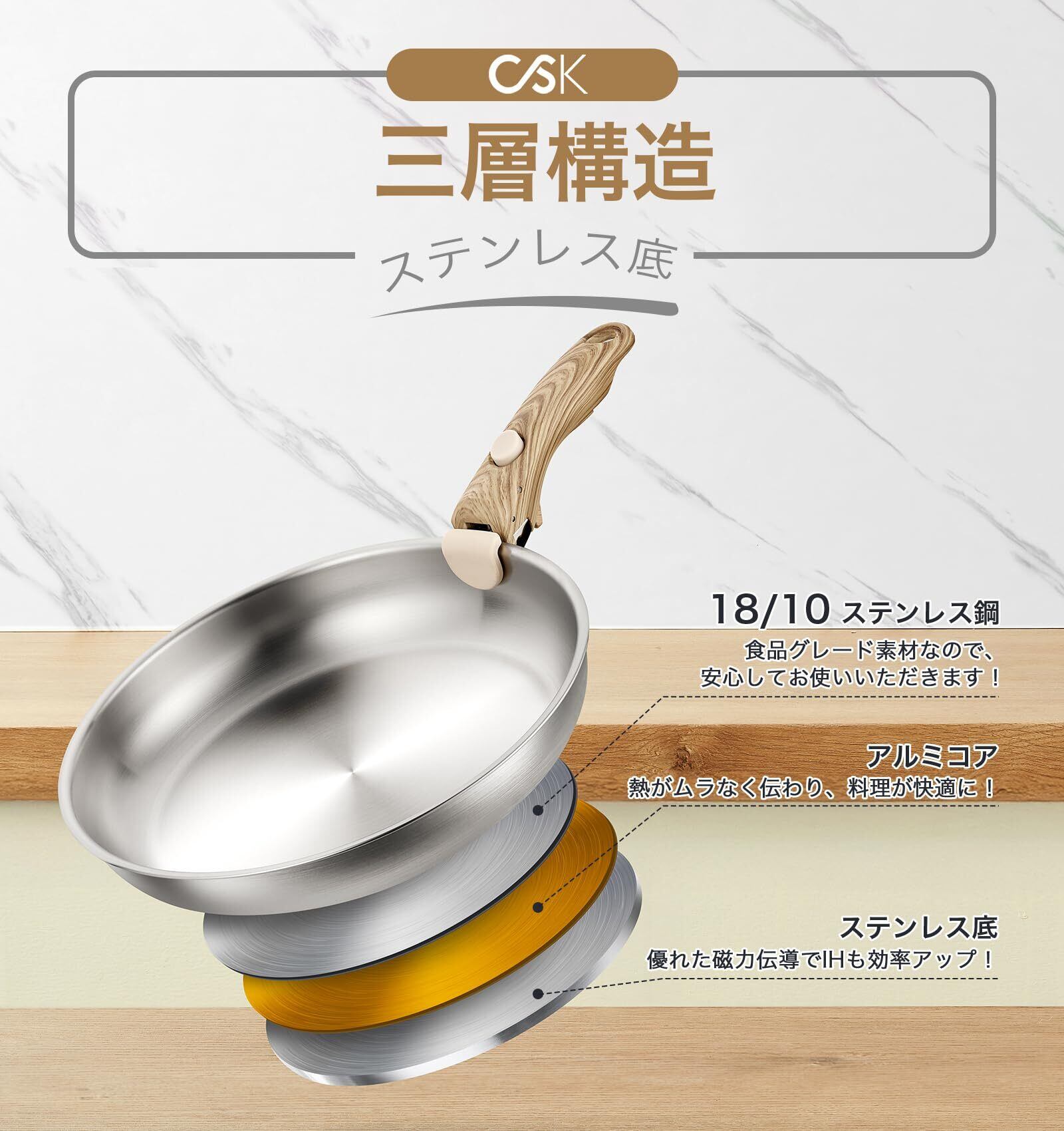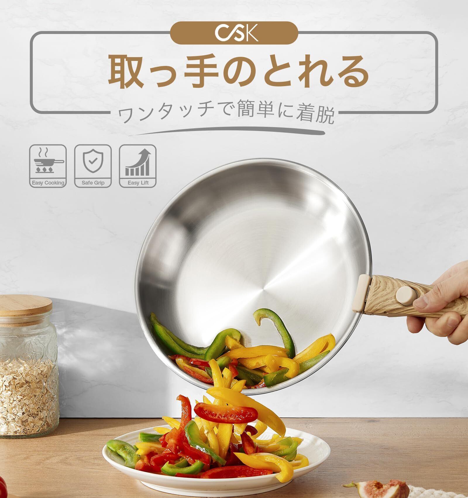 木目調のベークライトハンドル:耐熱性に優れ、熱くなりにくい安心デザイン。ワンタッチで着脱でき、快適な使い心地を実現。モダンなキッチンに映えるスタイリッシュなデザイン。フライパンをそのまま器として使えるほか、スタッキング収納も可能。