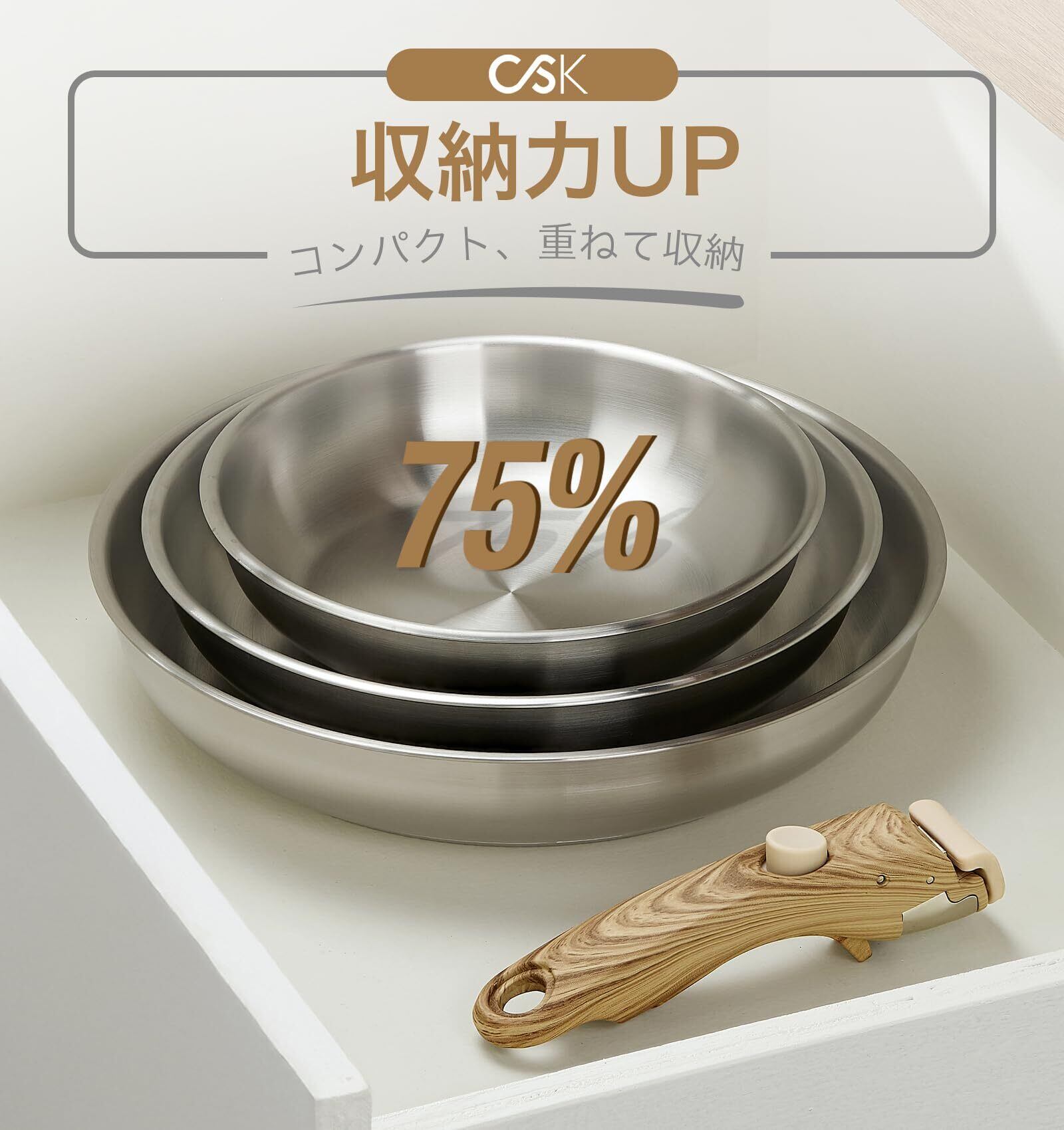 約75%の収納スペースを節約:取っ手のとれるのより、全てのステンレス鍋をすっきり重ねて収納可能。従来より最大75%のスペースを節約できます。コンパクトなキッチンやキャンピングカー、アウトドア調理に最適な鍋セットです。