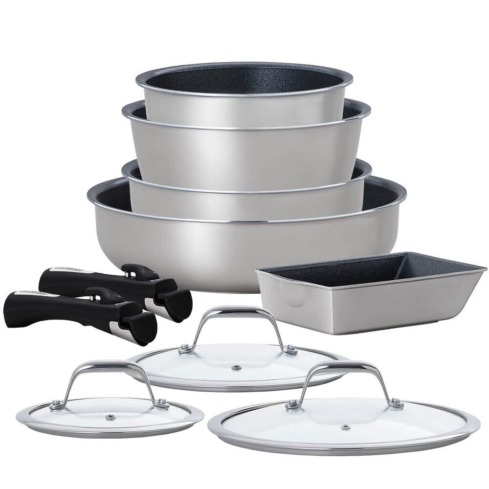 セット内容:フライパン(20/26cm)、なべ(16/20cm)、エッグパン、ガラスふた(16/20/26cm)、専用マルチハンドル×2