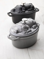 楕円のフォルムはお魚まるごと一匹や、野菜そのままなど、食材に合わせた調理が可能です。ブタの愛らしいデザインをお楽しみください。 テーブルにお鍋のままお出しいただくと、お料理が冷めにくく温かい状態を保ちます。