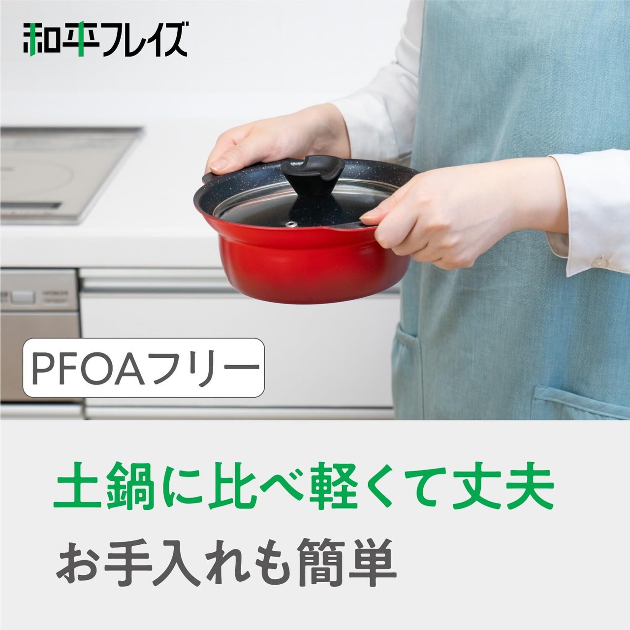 PFOAフリーのふっ素樹脂加工が施されており、焦げ付きにくく、調理後のお手入れも簡単です。忙しい日常の中でもストレスなく使えるのが嬉しいポイントです。煮物やおでん、鍋料理など多彩な料理が楽しめます。
