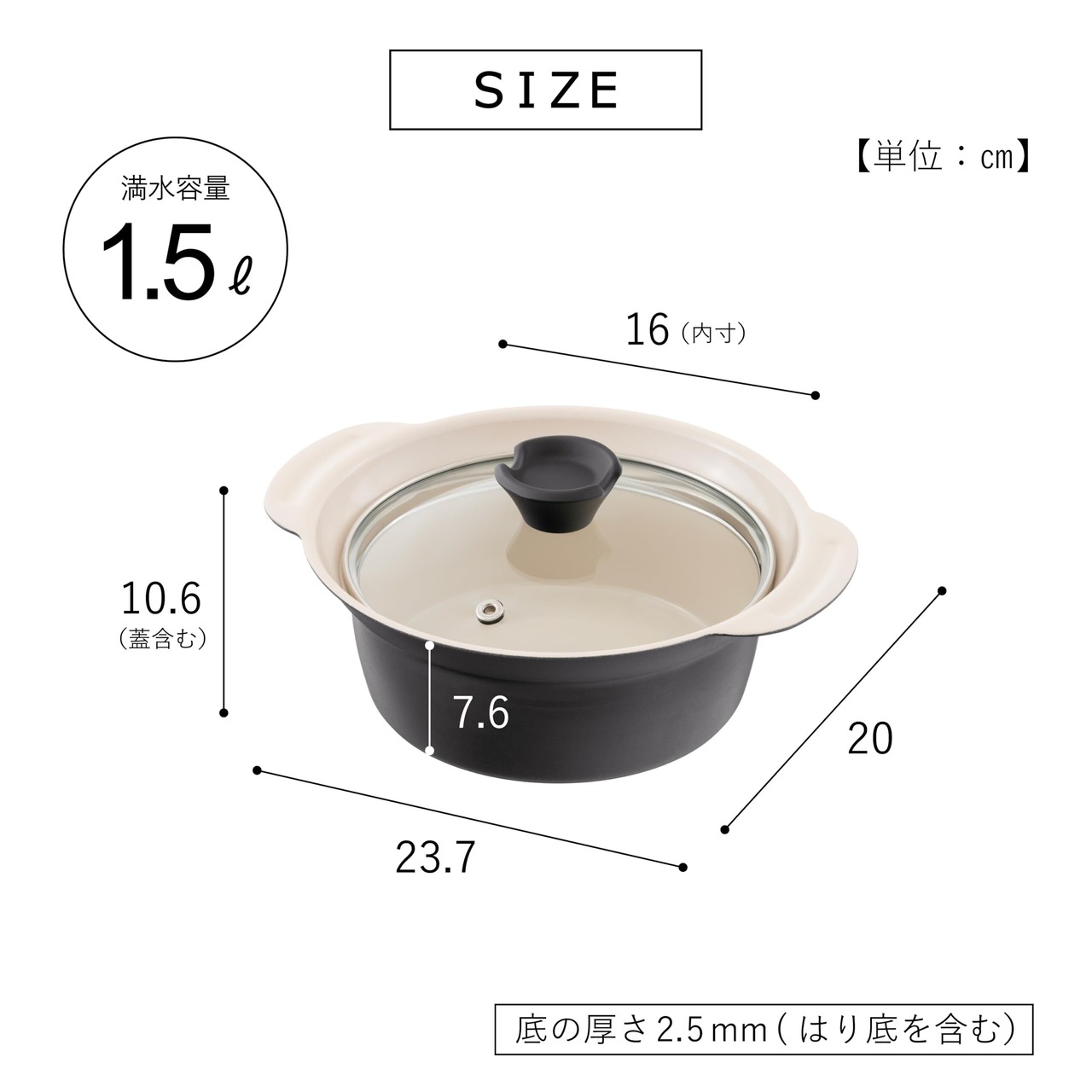 【材質】本体・蓋:アルミニウム合金、ガラス 蓋ふち取り・はり底:ステンレス鋼 つまみ:フェノール樹脂