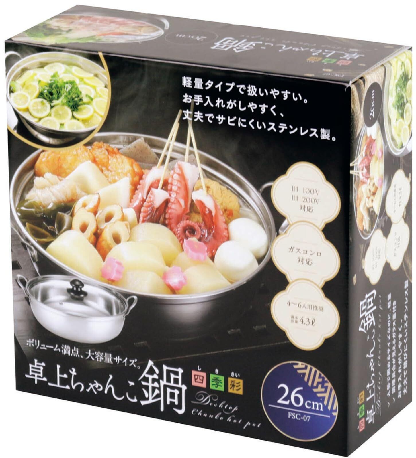カクセー(Kakusee) 卓上鍋 ちゃんこ鍋 26cm 4~6名用 両手鍋 ガスコンロ HI対応 軽量 ガラス蓋 ステンレス製 サビにくい 四季彩 しきさい FSC-07 シルバー