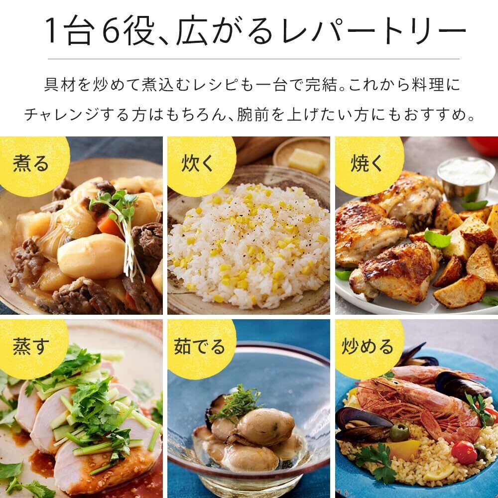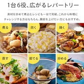 1台6役、広がるレパートリー。煮る・蒸す・炊く・茹でる・焼く・炒めるの6通りの調理が可能。