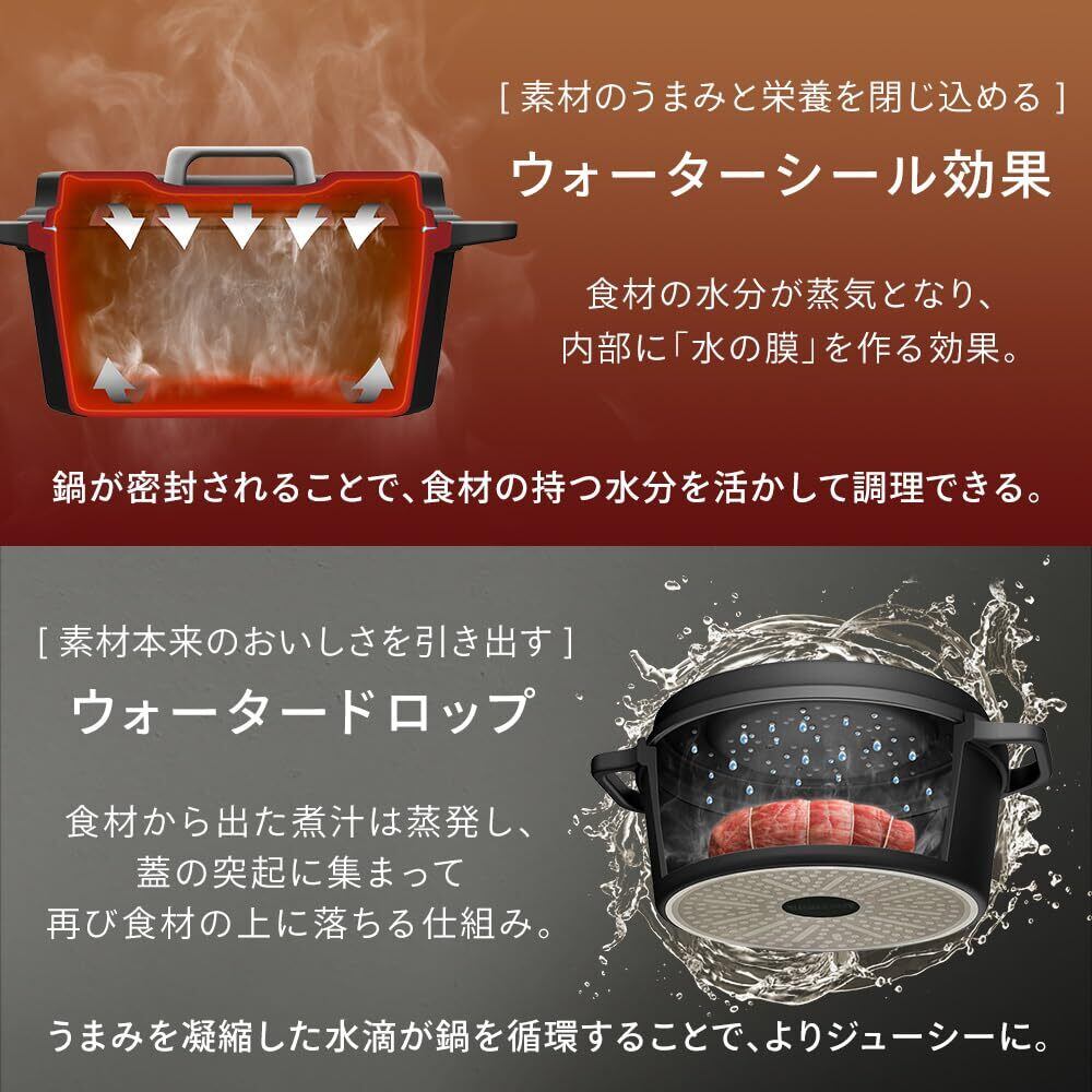 素材のうまみと栄養を閉じ込めるウォーターシール効果。鍋が密封されることで、食材の持つ水分を活かして調理できる。