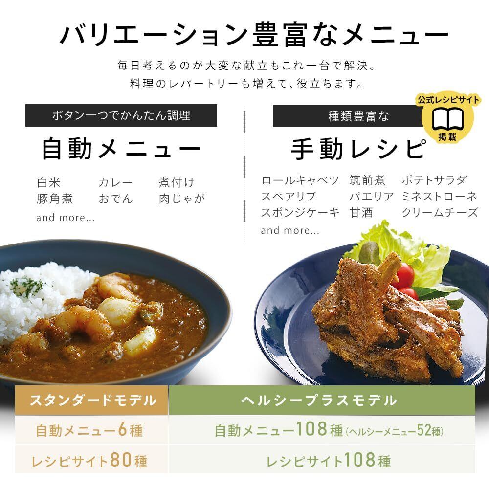 いろんな料理に挑戦したい方におすすめな“ヘルシープラスモデル[自動メニュー108種(ヘルシーメニュー52種)]。