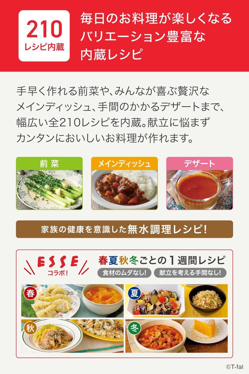 【特長1】多彩なレシピ内蔵で、献立に悩まない(ESSEとコラボ開発した1週間レシピや無水調理レシピのほか、前菜・メインディッシュ・デザートなど、全210種類のレシピを内蔵。)