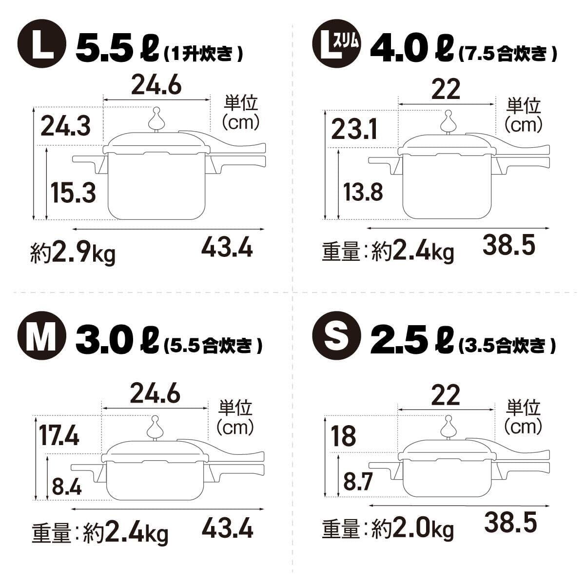 【容量】Mサイズ(3.0L / 5.5合炊き) 【サイズ】外径24.7cm×高さ17.7cm(本体高さ8.6cm)×最大長43.5cm 【重量】約2.5kg 高さ、重量はすべて蓋・ゼロオモリを含みます。