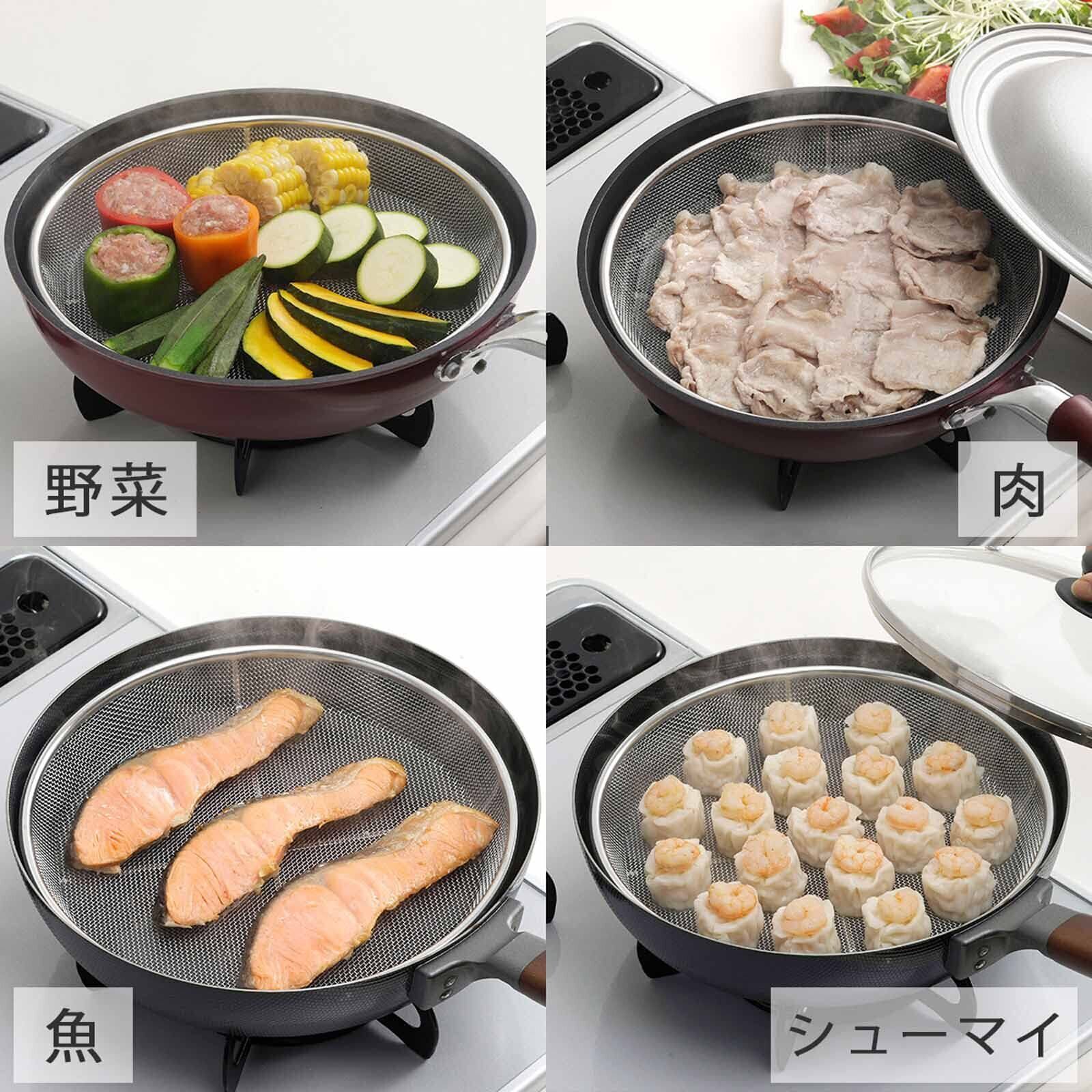 下村企販 フライパンで使える 蒸しざる 25cm 【日本製】 食洗機対応 フライパンで手軽に蒸し料理 水切れがいい 14メッシュ 脚付き 肉まん 焼売 そうめん とうもろこし 蒸し器 ステンレス 燕三条 43201