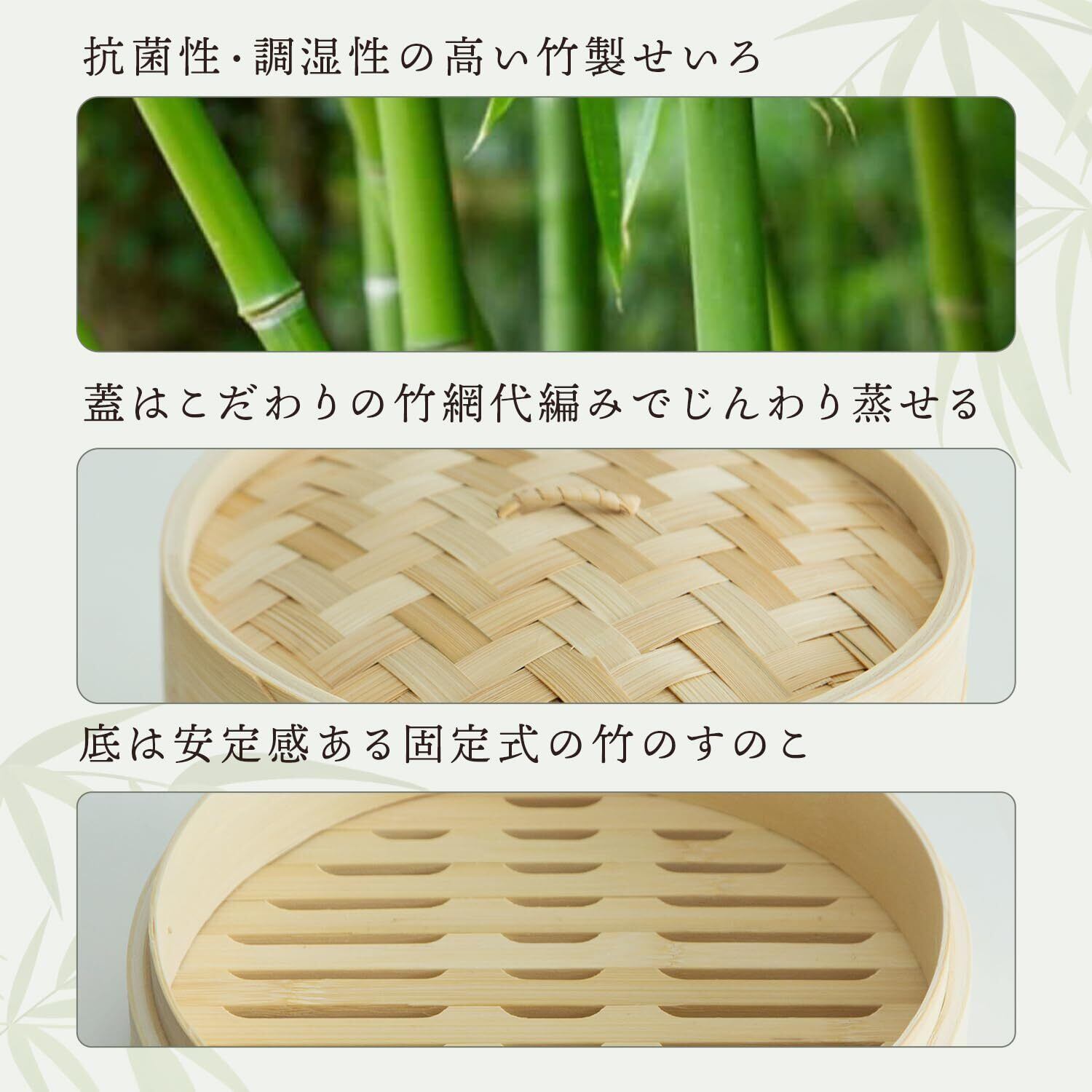 【こだわりの「竹網代編み蓋」と、安定感ある固定式の「すのこ底」】蓋には竹網代編みが施されており、余分な蒸気を程よく逃し、水滴が食材に落ちることを防きます。また蓋がせいろ全体の水分量を調節してくれるので、食材をムラなく低温でじんわり蒸すことが出来ます。竹すのこ底は通気性に優れており、かつ纎維の密度が高ㄑ食材を蒸す時の水蒸気を吸収するため、蒸し器の底・内側に水滴がたまりにくく、食材本来の栄養や香り、甘みを閉じ込めながら蒸し上げられます。