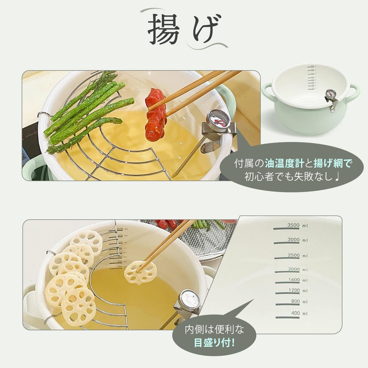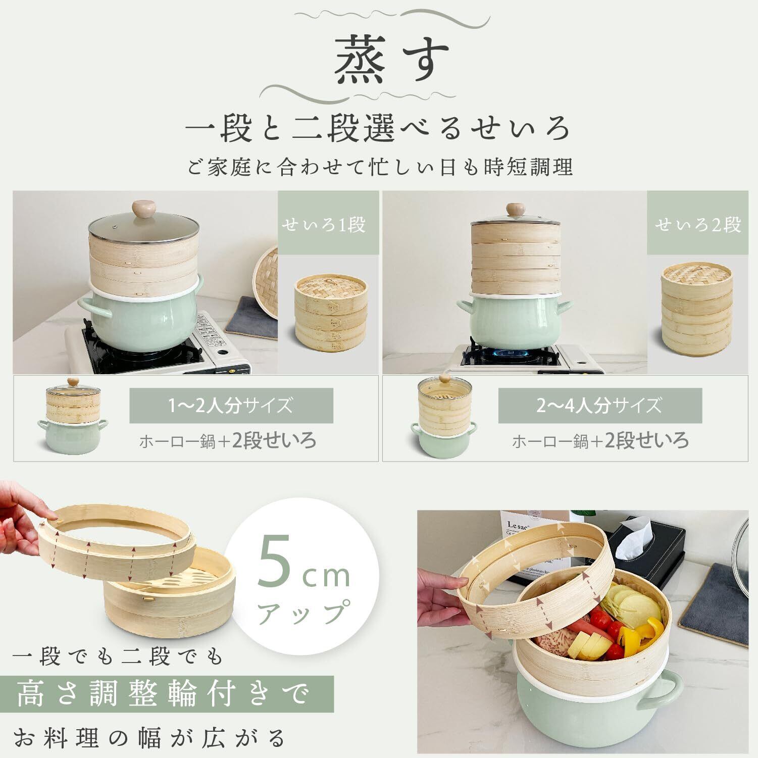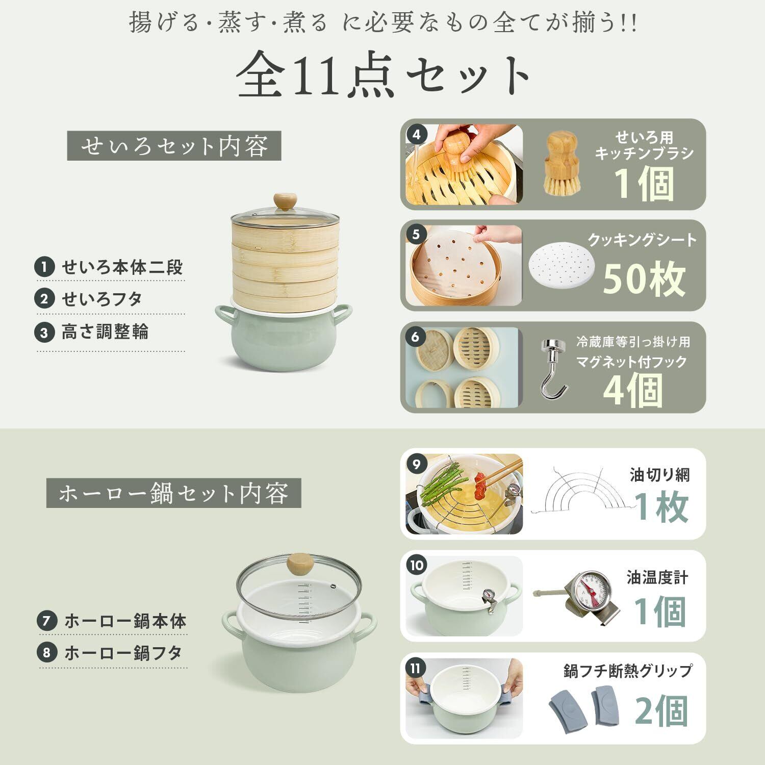 【セット内容】 「せいろ」①フタ 1点 ②本体1段 or 2段 ③高さ調整輪 1点 ④せいろ用キッチンブラシ 1点 ⑤マグネットフック 4点 ⑥蒸し紙 50枚 「ホーロー鍋」①フタ 1点 ②鍋本体 1点 ③油温度計 1点 ④揚げ物網 1点 ⑤持ち手用断熱グリップ 2点