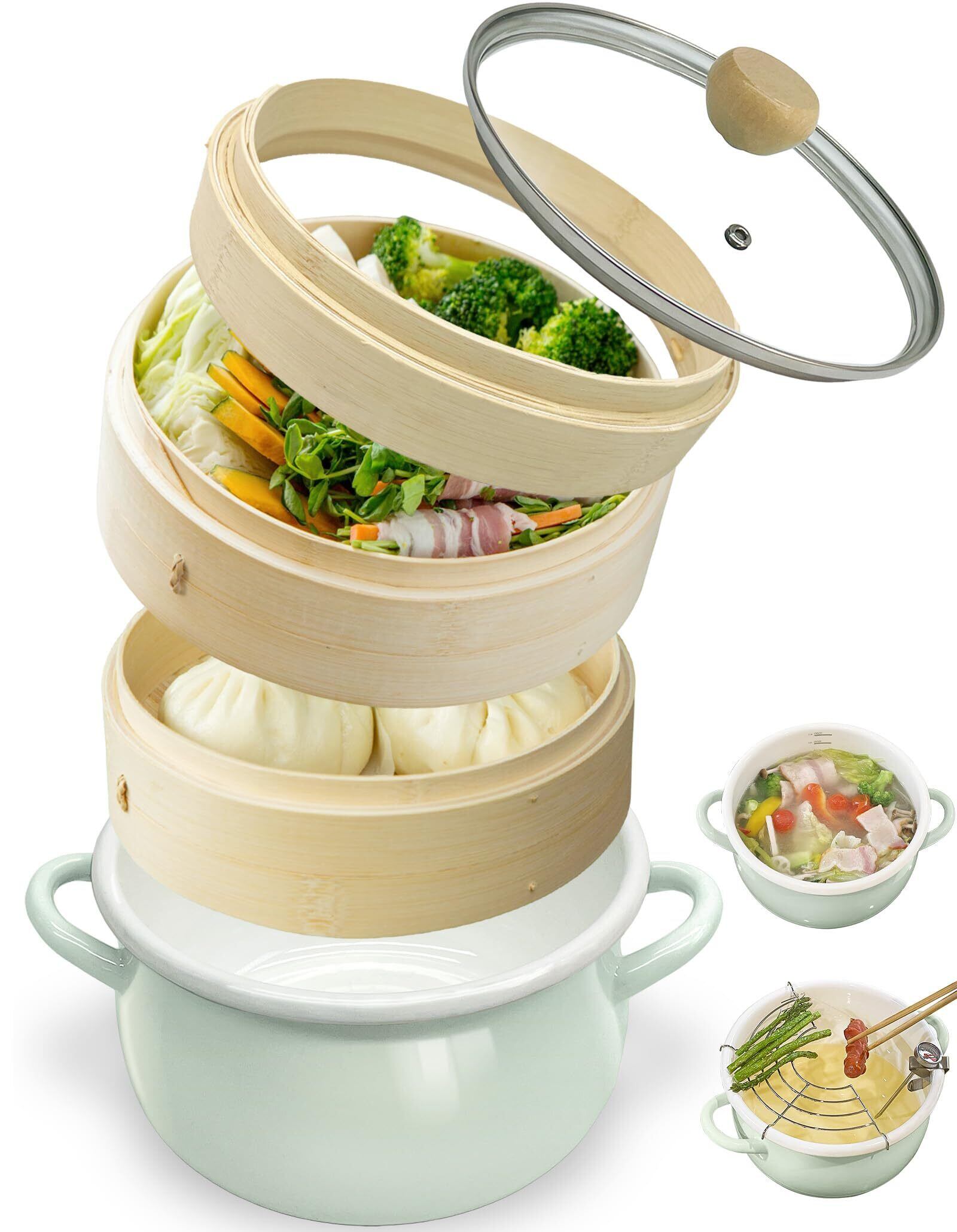 DQ CORAL【IH対応&ガス火対応】ホーロー 両手鍋 22cm セージグリーン + 2段 せいろ 21cm セット ガラス蓋付 揚げ物 天ぷら 串揚げ 鍋 琺瑯 焦げ付きにくい 鍋料理 すき焼き鍋 煮物 おでん 蒸し器 中華せいろ 職人手作り 健康調理