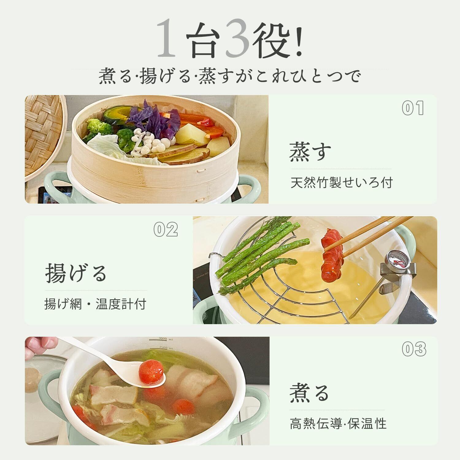 【1台3役ホーロー鍋とせいろのセット】1台で「蒸す」「揚げる」「茹でる」が実現する充実のセット内容。ホーロー鍋はキッチンが映える当店オリジナルのニュアンスカラーの3色展開です。