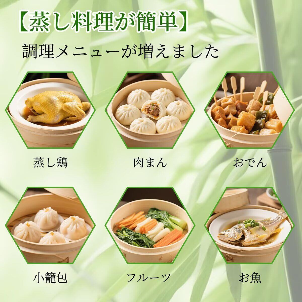 【多様な料理に対応】蒸し調理が簡単にできて、調理メニューが増えました。茶碗蒸し、ふかし芋、おこわ、蒸し鶏、お菓子、おでん、お肉、お魚等は勿論ですが、冷たいご飯や肉まん、小籠包、シュウマイの温めにも、アイディア次第で色んな料理を楽しめます。