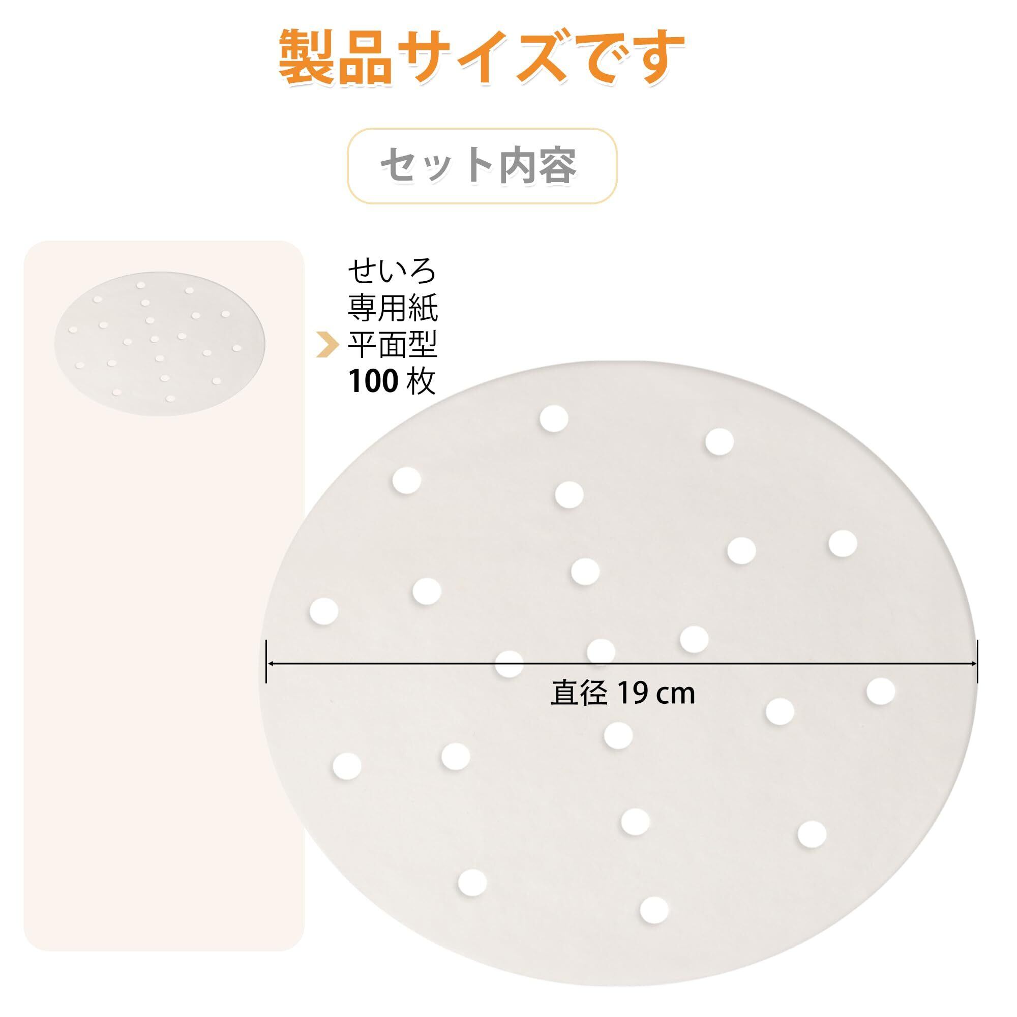 サイズ:直径 19 センチ、数量は 100 枚/パックで、内径 20 センチ以上の蒸し器に適用します。21㎝の蒸篭にぴったりで、使いやすい