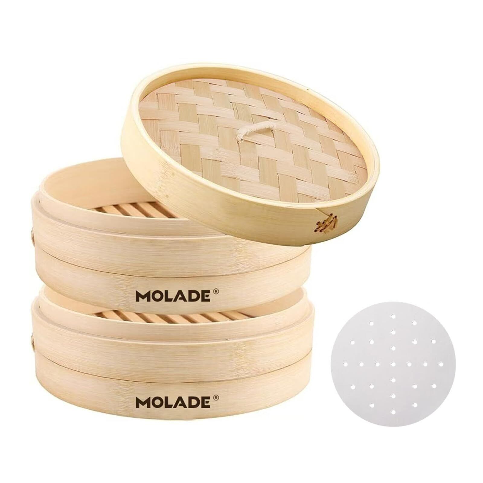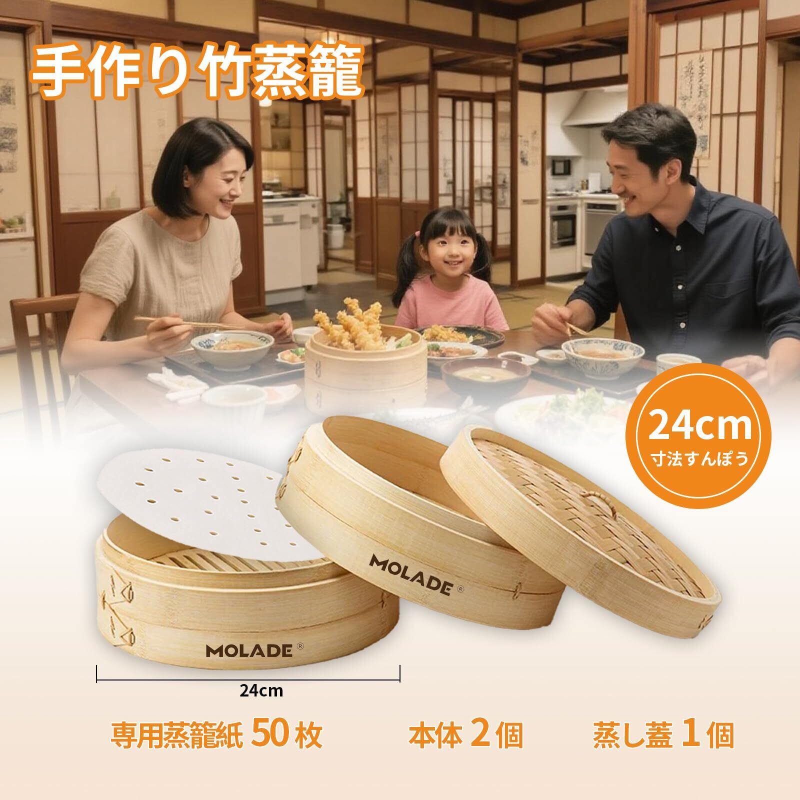MOLADE 竹せいろセット 手作り竹せいろ 天然竹せいろセット 中華せいろ 専用竹紙50枚付き 業務用せいろ(竹せいろ直径約24cm) 中華せいろ本体2個・蓋1個セット (竹セイロ直径約24cm)