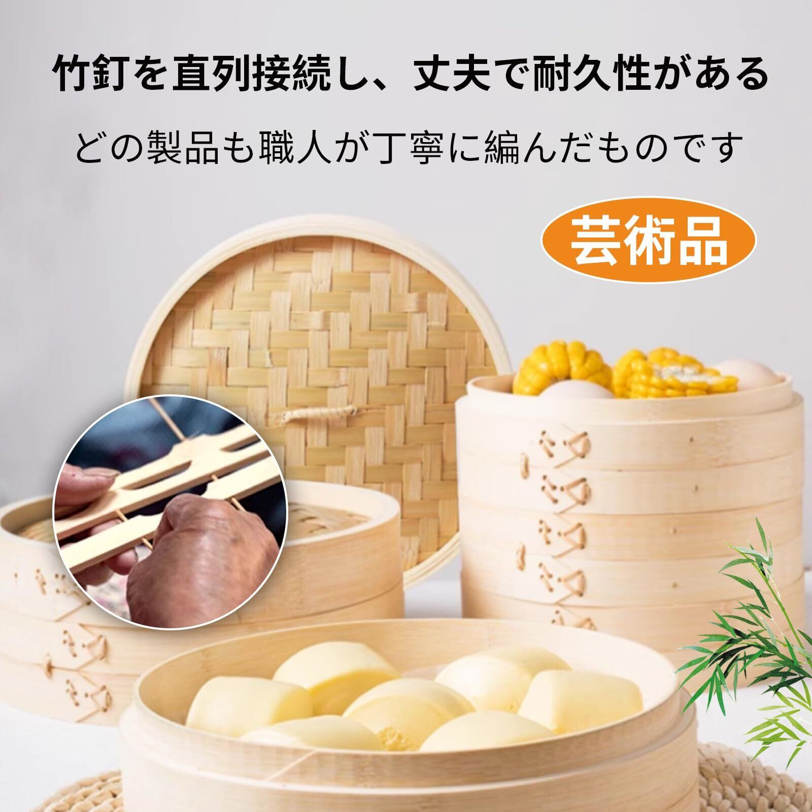 【スチーマーの使い方】使用前(初回使用時)1.水でよく洗い、鍋に十分な量の水を入れる2.蒸し器を鍋に入れ(お茶を少し入れても可)、5~10分間空蒸ししてから通常通り使用してください(ヒント:竹の中の黄水を煮出して除去するために蒸す) 使用後1.食物を蒸した後、蒸し器は必ずきれいに洗い、風通しの 良い場所で水分を乾かしてください2.長期間使用しない場合は、洗浄後に熱湯で消毒し、蒸し器を使用してください