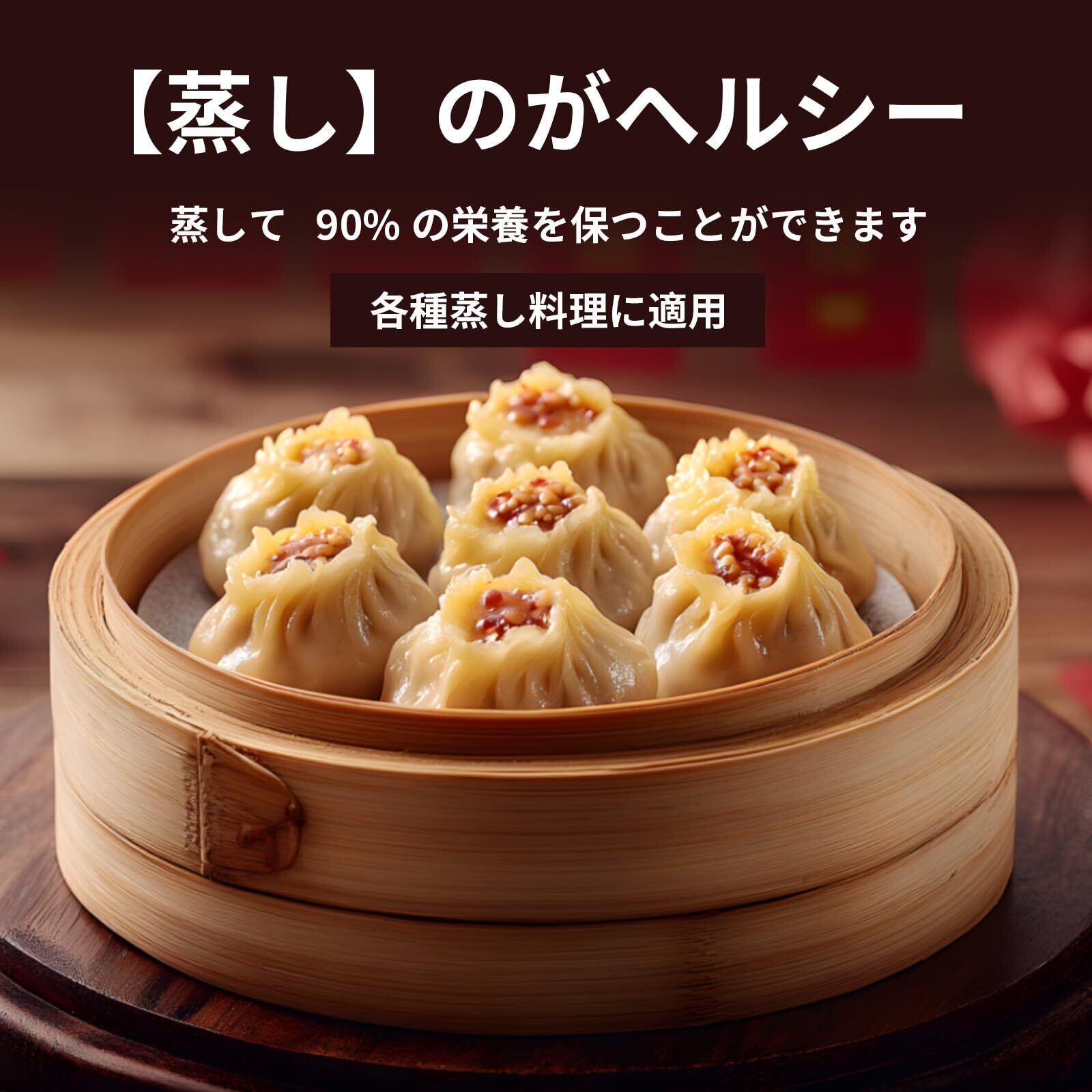 【100%天然竹製せいろ】当社のせいろ蒸し器は天然竹を使用しており、杉や檜などの木製蒸篭と比べ、化学塗料や接着剤を一切含みません。高温時にほのかな竹の香りが立ち、食材の本来の味を損ないません。竹は均一に熱が伝わるため、蒸し上がりがふんわり仕上がります。抗菌性に優れ、乾燥が早く、長期間ご使用いただけます(推奨交換周期1-2年)。健康的な食生活を求める主婦や、食材の原味を大切にする料理愛好家に最適です