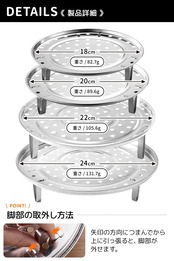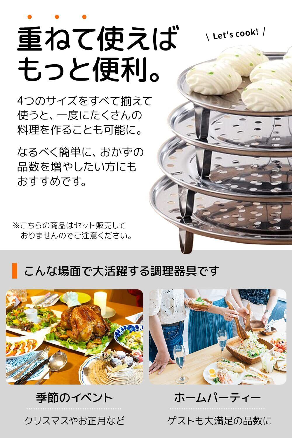 【 様々な料理をお楽しみください! 】 中華料理や魚料理、蒸しパンなどのお菓子作りなど多種多様な料理にトライしてみてはいかがでしょうか【 商品仕様 】 ●「カラー」シルバー ●「サイズバリエーション」18cm、20cm、22cm、24cm※詳細サイズは画像にてご確認ください。●「材質」410ステンレス鋼