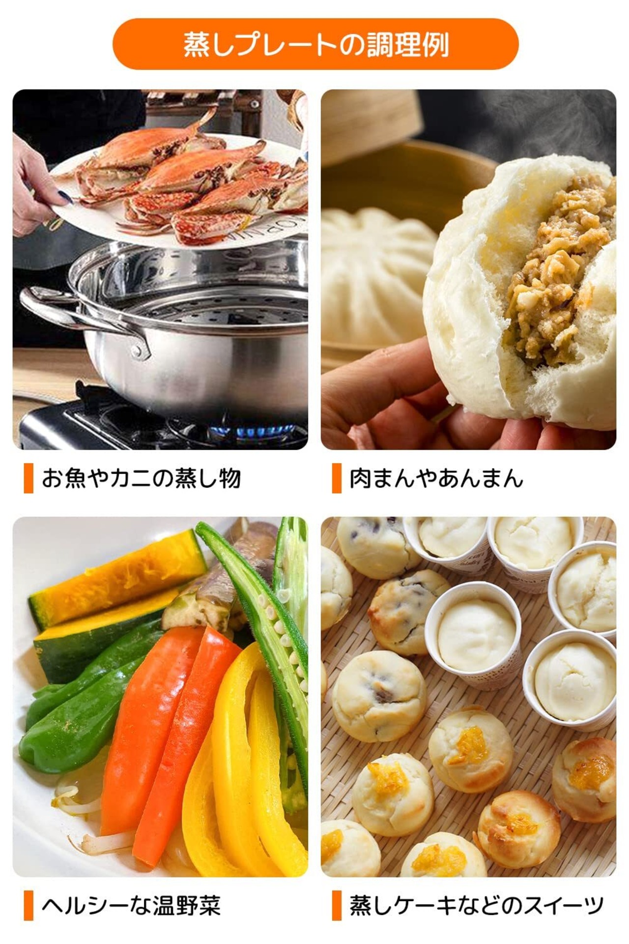 【 料理のバリエーションが増える 】 栄養も逃しにくい蒸し料理に挑戦してみませんか 本製品のスチール製の蒸しプレートで、ご家庭でも簡単に蒸し料理をお楽しみいただけます。野菜、エビ、魚、肉まん、餃子など様々な食材を蒸して、美味しくヘルシーに調理できます 炒める、煮る、茹でることの他に、料理のバリエーション増加にお役立てください!