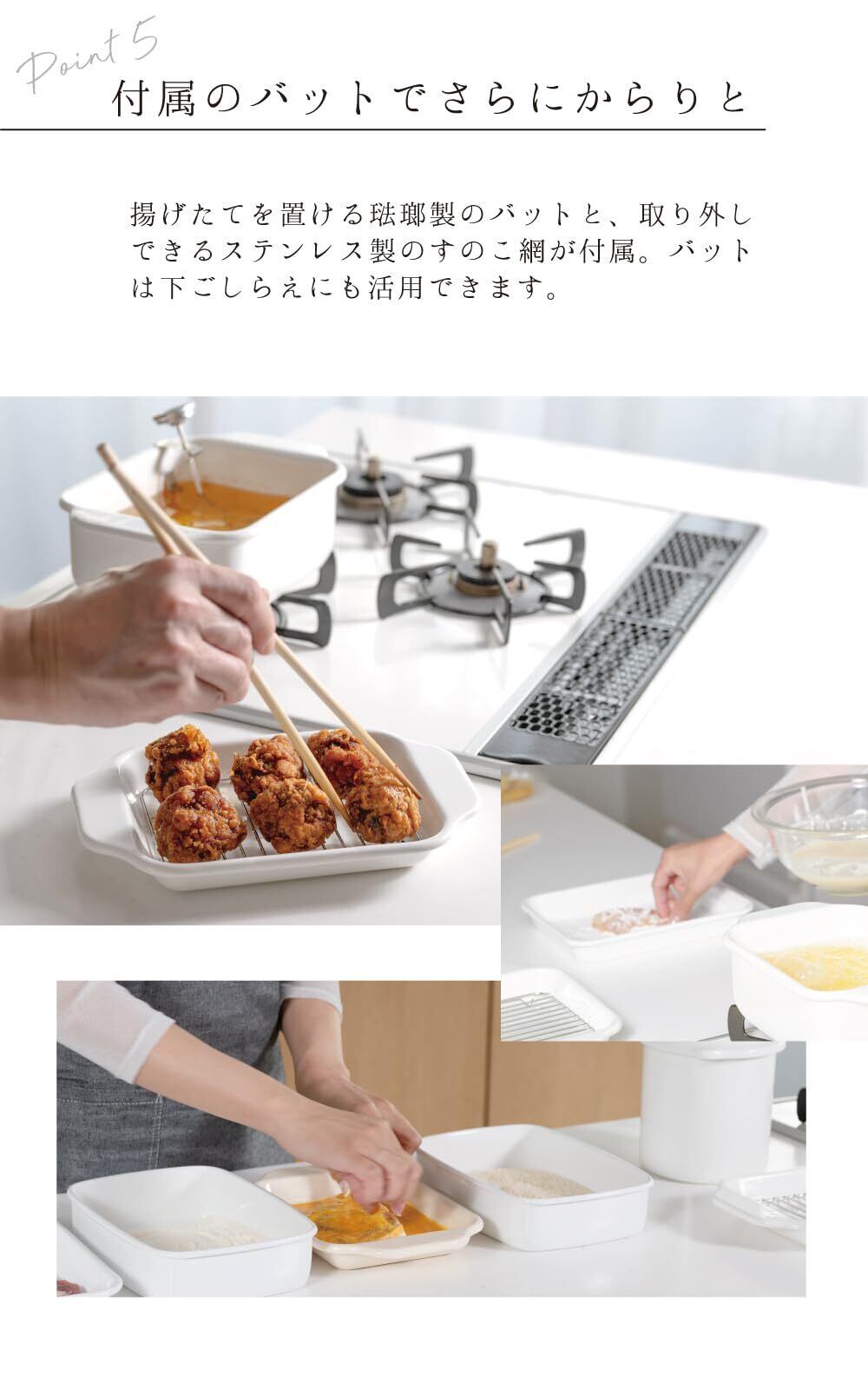 【Point.5】付属のバットでさらにからりと揚げたてを置ける琺瑯製のバットと、取り外しできるステンレス製のすのこ網が付属。別で用意しなくていいから、そのまま揚げ物調理が始められます。