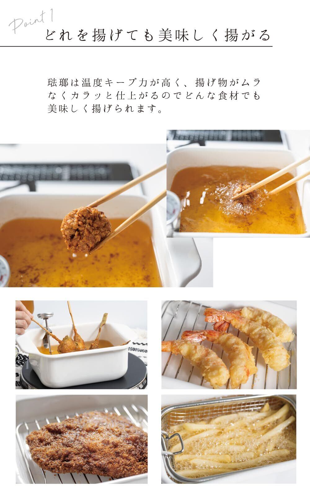 【Point.1】どれを揚げても美味しく揚がる。ホーローは熱をじんわり伝えてくれるので、油温が安定しやすく、揚げ物がカラッと軽やかに仕上がります。天ぷらやから揚げもおいしく仕上げやすいのが魅力。