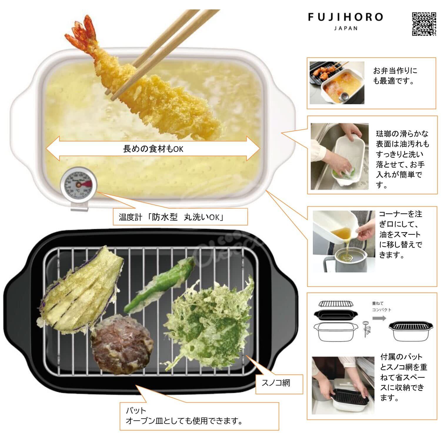 富士ホーロー 角型天ぷら鍋 IH対応 温度計付き 揚げ網 バット付き ライトグレー ホーロー 琺瑯 TP-20K.LG